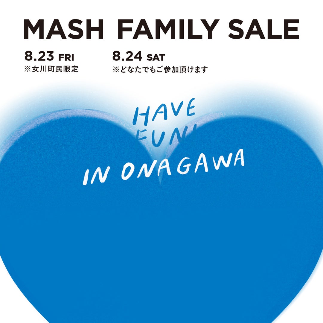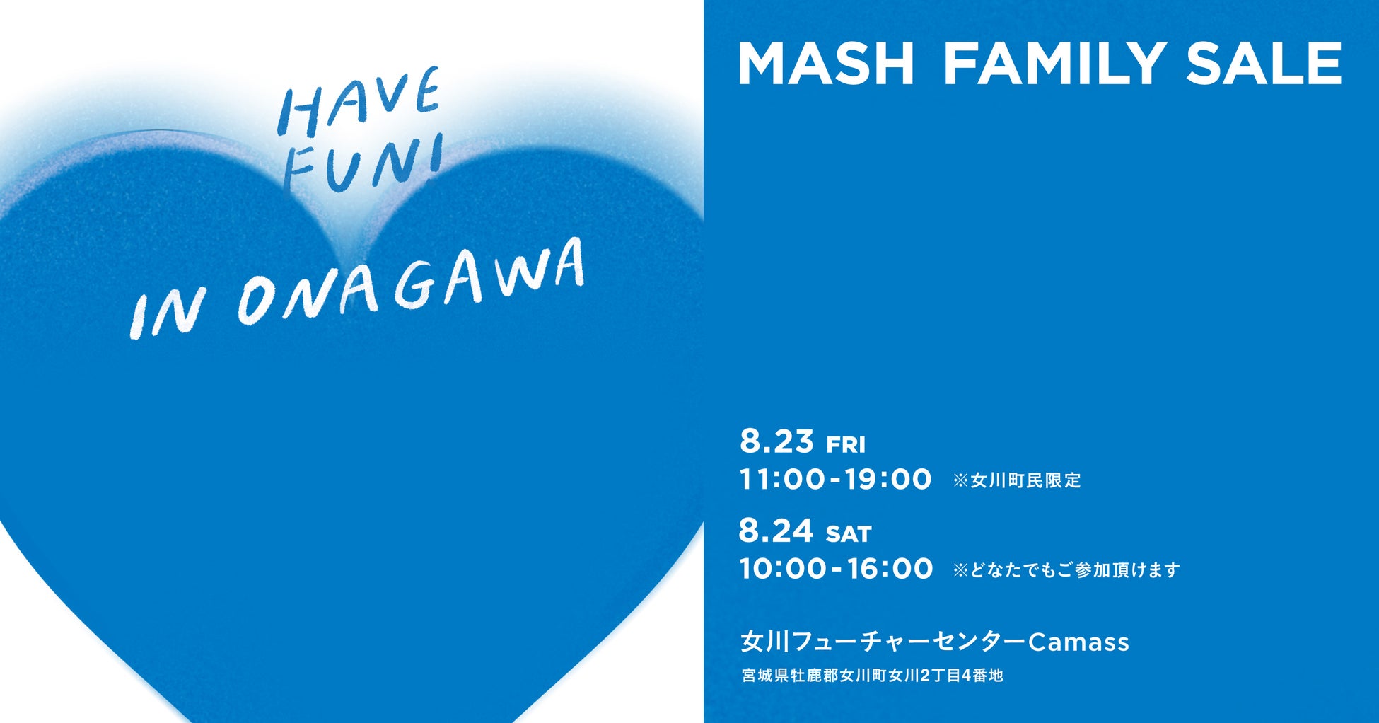 ファッション、ビューティー、フード、デザイン、ライセンスなど多岐にわたる事業を展開している株式会社マッシュホールディングス(本社:東京都千代田区、代表取締役社長:近藤広幸)は、2024年8月23日(金)・24日(土)に宮城県女川町の女川フューチャーセンターCamassにて、MASH FAMILY SALE in ONAGAWAを開催いたします。今回のファミリーセールは、2021年8月19日にマッシュグループが女川町に寄贈したMASH PARK ONAGAWA(マッシュパーク 女川)の開園3周年を記念したイベントで、今回の売上金額はすべてマッシュグループが取り組む被災地復興支援活動「MASH PARK PROJECT」に寄付いたします。