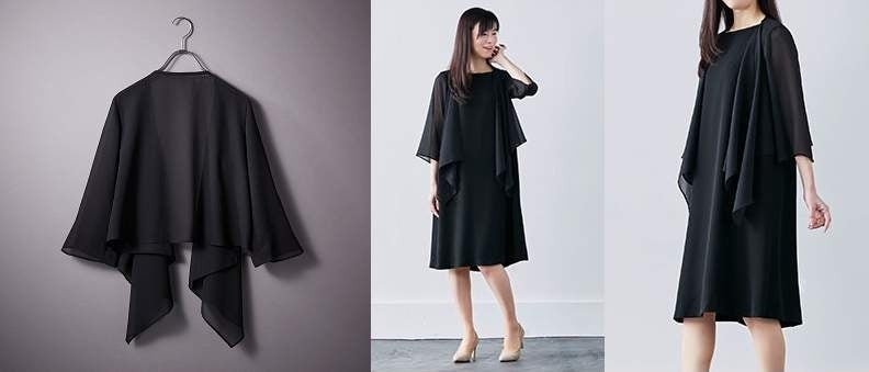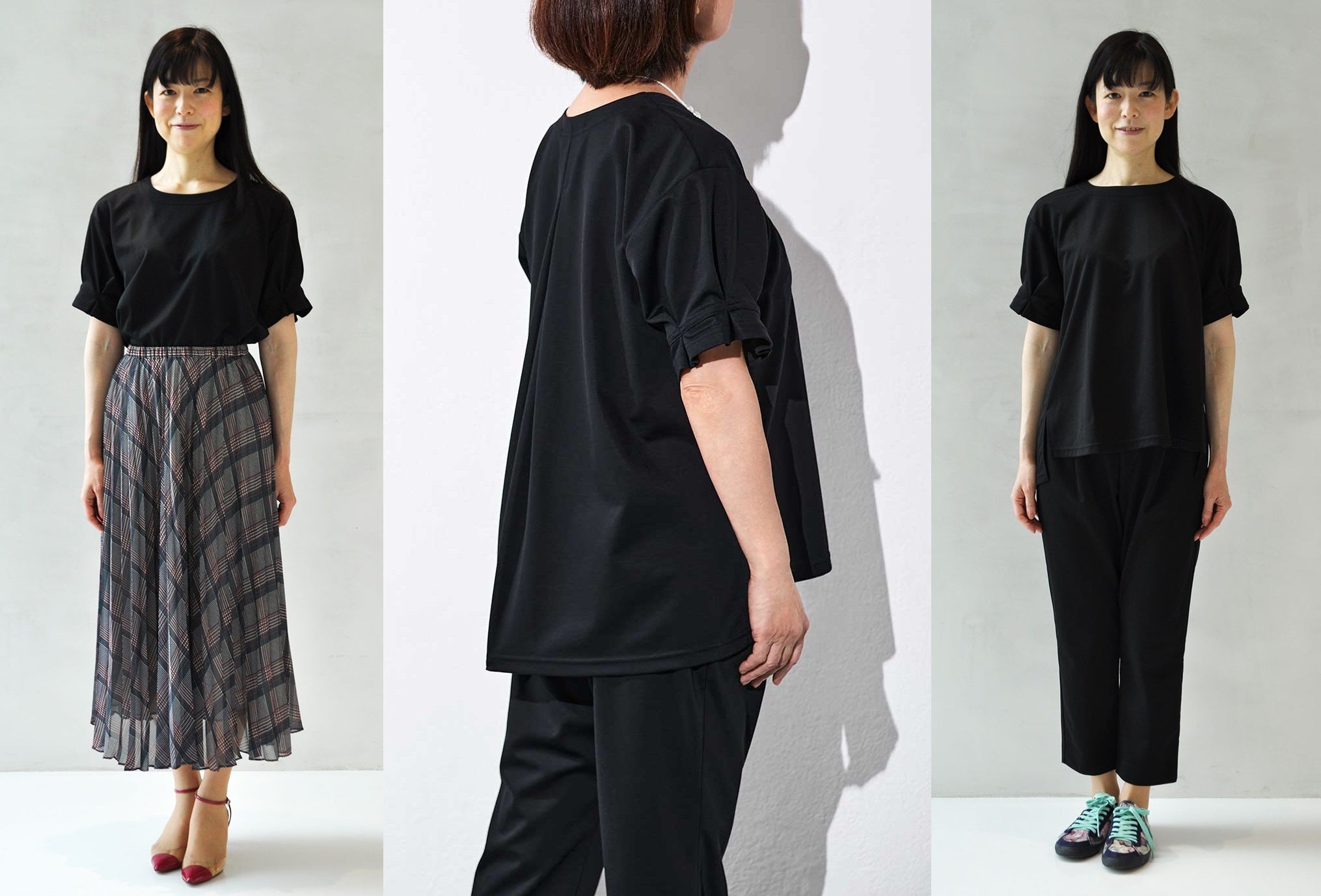 広過ぎず鎖骨に沿った衿ぐりのライン、適度なゆとりとドレープにより、服の中で身体の線がゆれ、細く見せるラインができ上がるので体型をカバーし安心して着用できます。