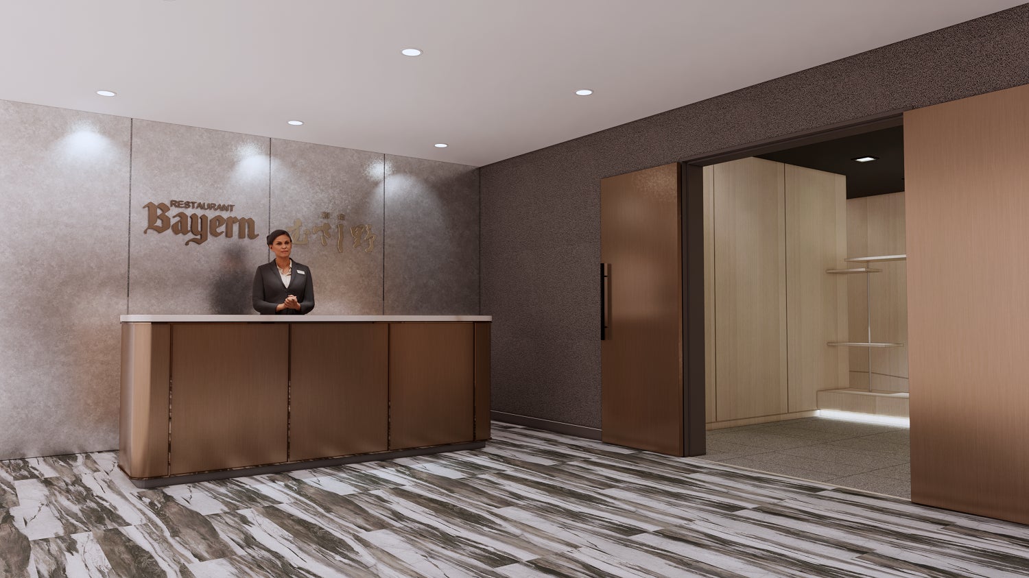 重厚感あるアプローチ導線と設えを一新した受付カウンター