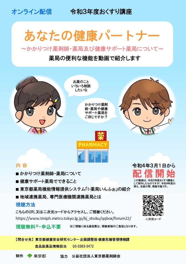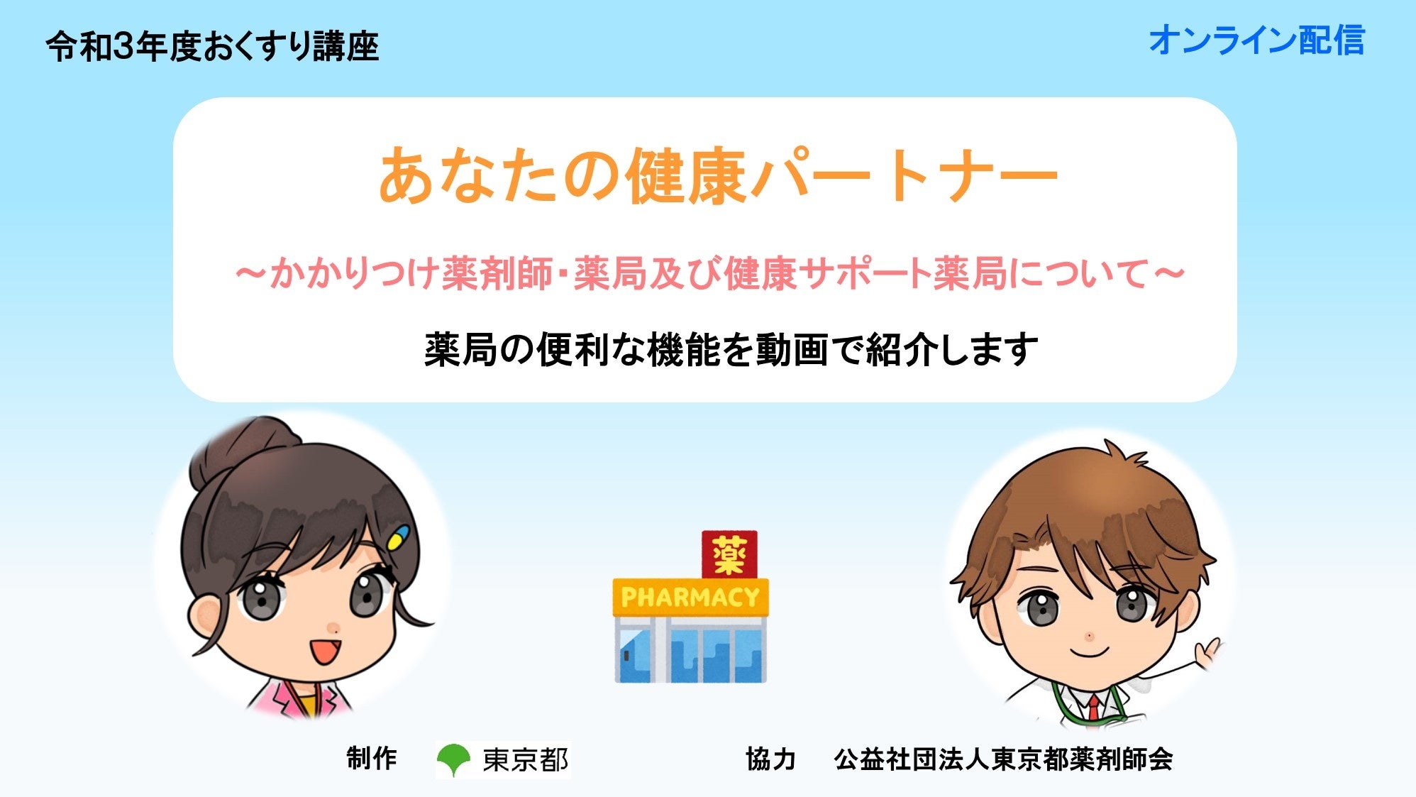 薬剤師の東(ひがし)さんと患者である都(みやこ)さんが会話をしながら、かかりつけ薬剤師・薬局及び健康サポート薬局、地域連携薬局などについて、紹介していきます。薬局の機能をもっと知りたいとお考えの都民の方に、ぜひご視聴いただきたい内容です。