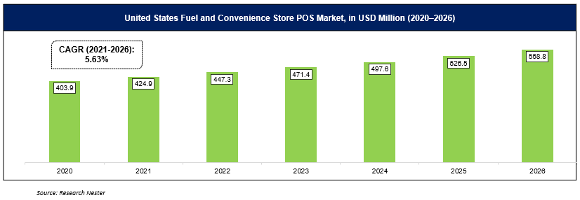 米国の燃料およびコンビニエンスストアのPOS市場は、2020年の403.9 百万米ドルの収益から、2026年末までに558.8 百万米ドルの収益を生み出すと予想されています。