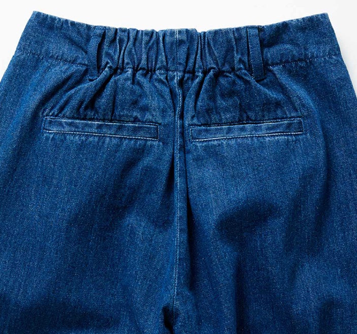 丸みのあるぼんたんシルエットのデニムパンツです。やわらかなライトオンスデニムで、ボリュームがあるのにはき心地は軽やかです。丸みのあるシルエットですが、フロントタックとハイウエストで腰高&すらっとした印象に見せることができます。