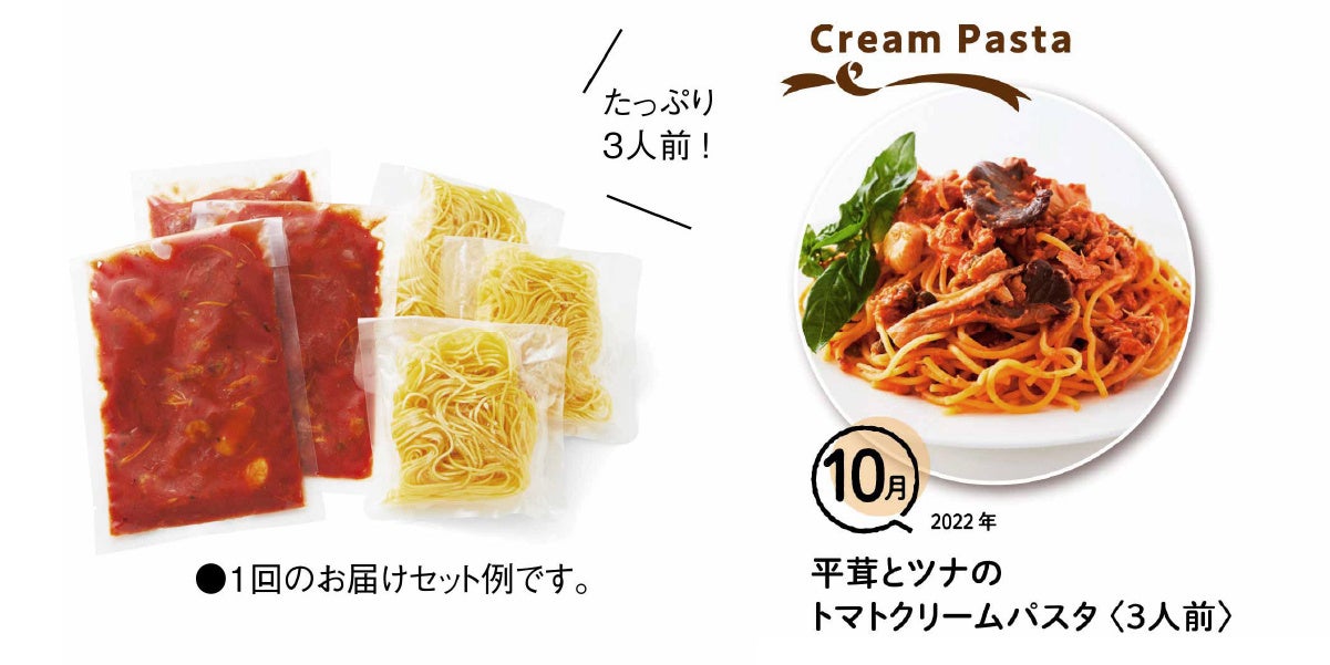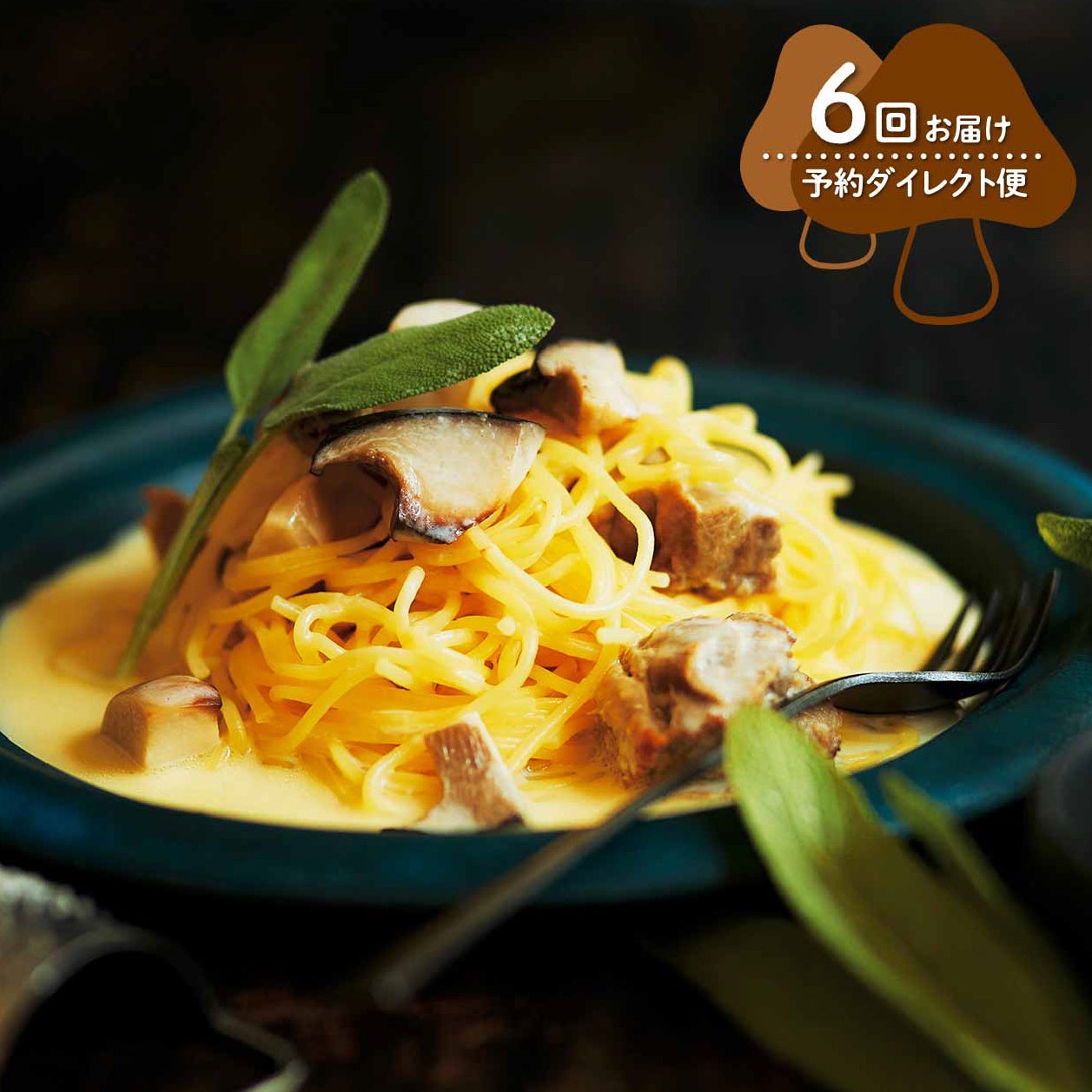 フレッシュな季節のきのこや旬の食材を厳選使用した、毎月変わるパスタソースと生パスタのセットです。毎月1種類、3人前が6ヵ月間届きます。