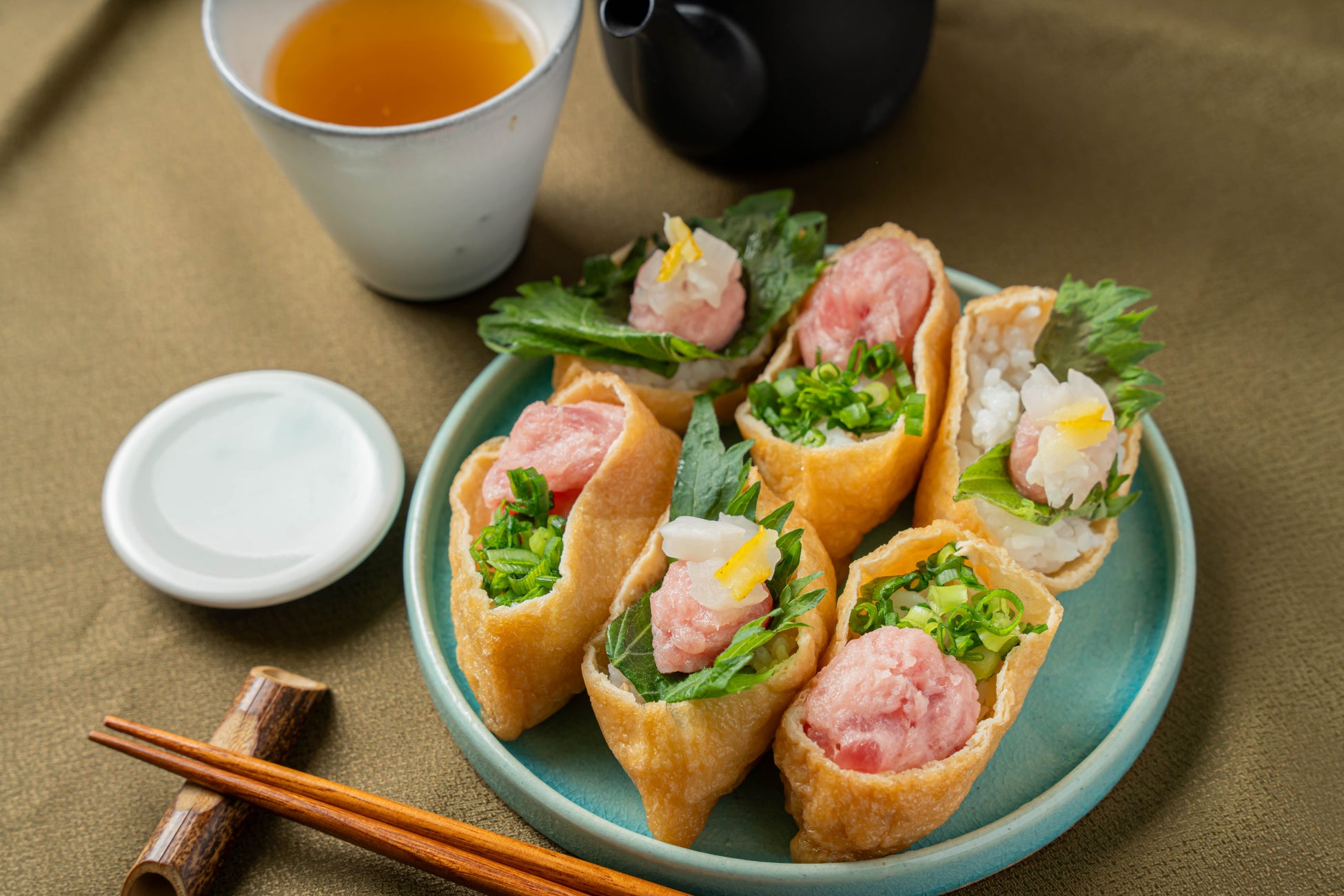 定番商品から季節に合わせた様々ないなり寿司を取り揃える、柚子酢を使用した一口いなり専門店<一口いなり むろや>。「とろたくいなり」はたくあんの食感、まぐろの柔らかさと甘みがいなりのあげと絶妙なバランスです。創業当初からの大人気の商品です。