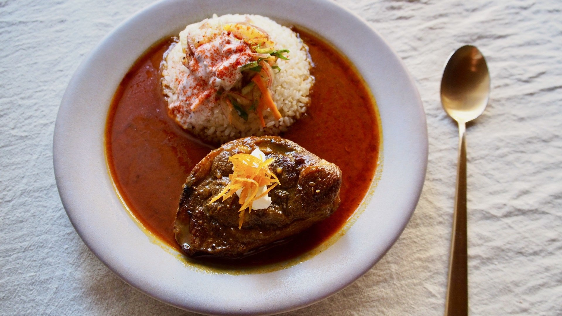 店舗を持たない「流しのカレー屋」として活動をスタートしたカレー専門店。拠点となる<kitchen and CURRY>を世田谷区羽根木にオープンし、旬の野菜を中心としたカレーを提供している<and CURRY>。今回は、豪快な骨つきラム肉を、香り高いスパイスと柑橘のソースと共に煮込んだ食べ応えのある「骨付きラム肉と柑橘のカレー」をご紹介。