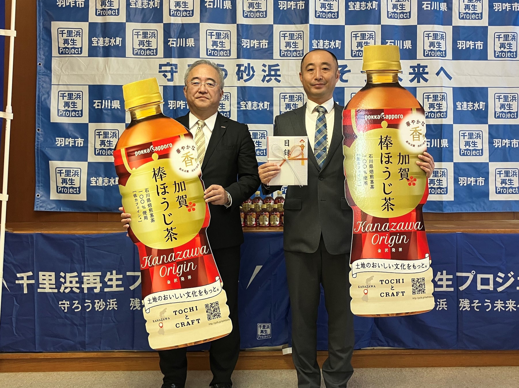 サッポロホールディングス(株)のグループ企業であるポッカサッポロフード&ビバレッジ株式会社(代表取締役社長:時松 浩、本社:愛知県名古屋市)は、 当社商品「加賀棒ほうじ茶」の地元である、石川県の「千里浜再生プロジェクト」に賛同し、2021年より「加賀棒ほうじ茶」の北陸エリアでの売上の一部(※1)を千里浜再生プロジェクト実行委員会に寄付しています。4回目となる今年も寄付金の贈呈を行いましたのでお知らせします。
