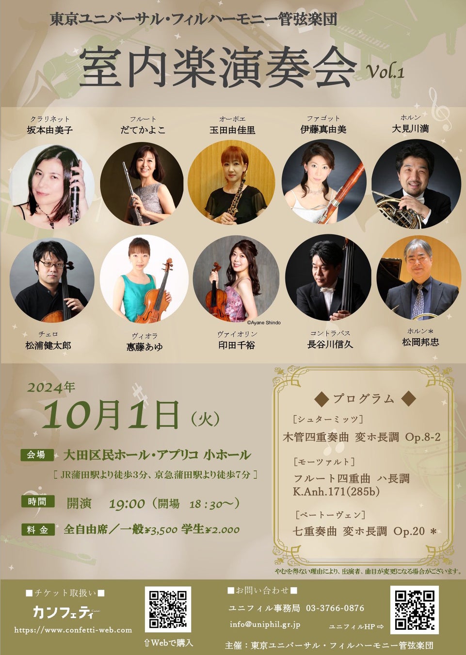 東京ユニバーサル・フィルハーモニー管弦楽団の楽団員による室内楽演奏会。ベートーヴェンの七重奏をメインに、弦楽器と木管楽器のアンサンブルをご堪能頂ける豪華プログラムをお届けします。