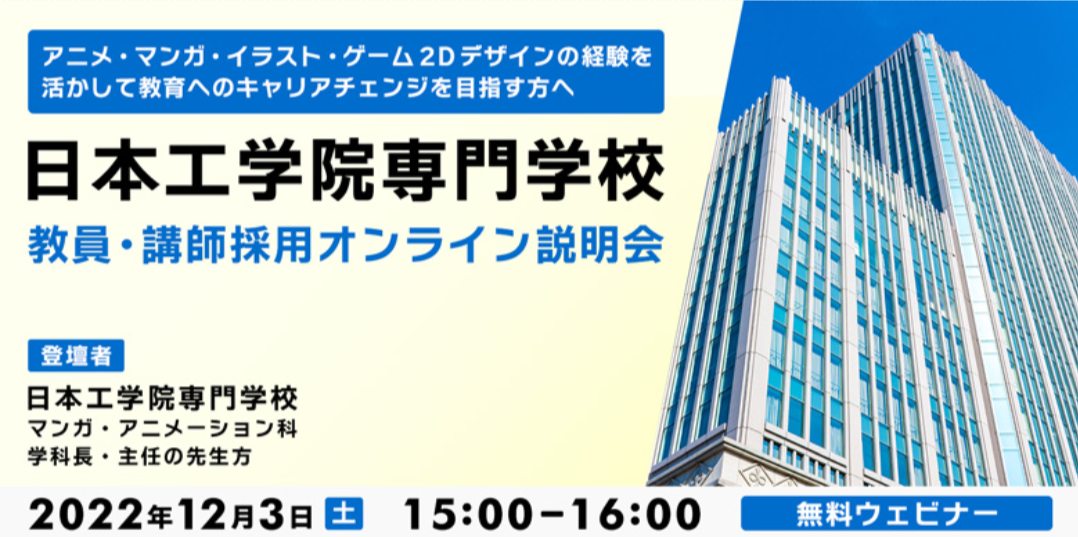 【マンガ・アニメ・ゲーム等】クリエイターから先生にキャリアチェンジ!12/3(土)日本工学院専門学校 教員・講師採用オンライン説明会