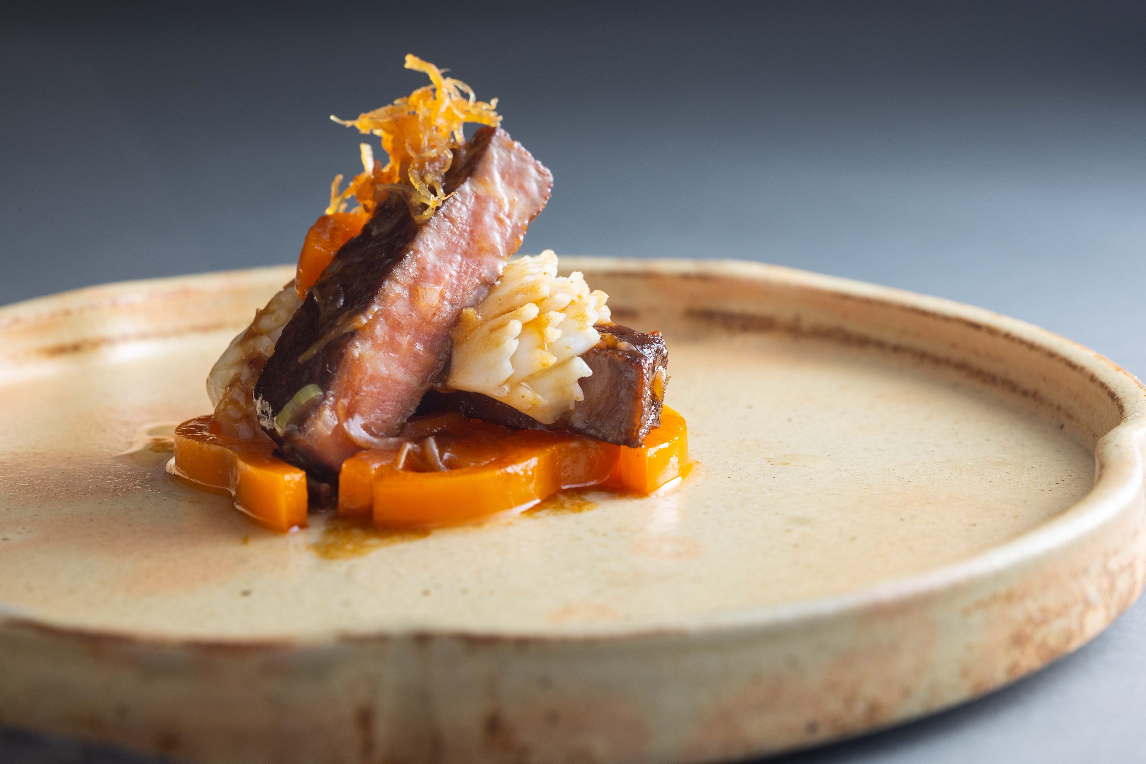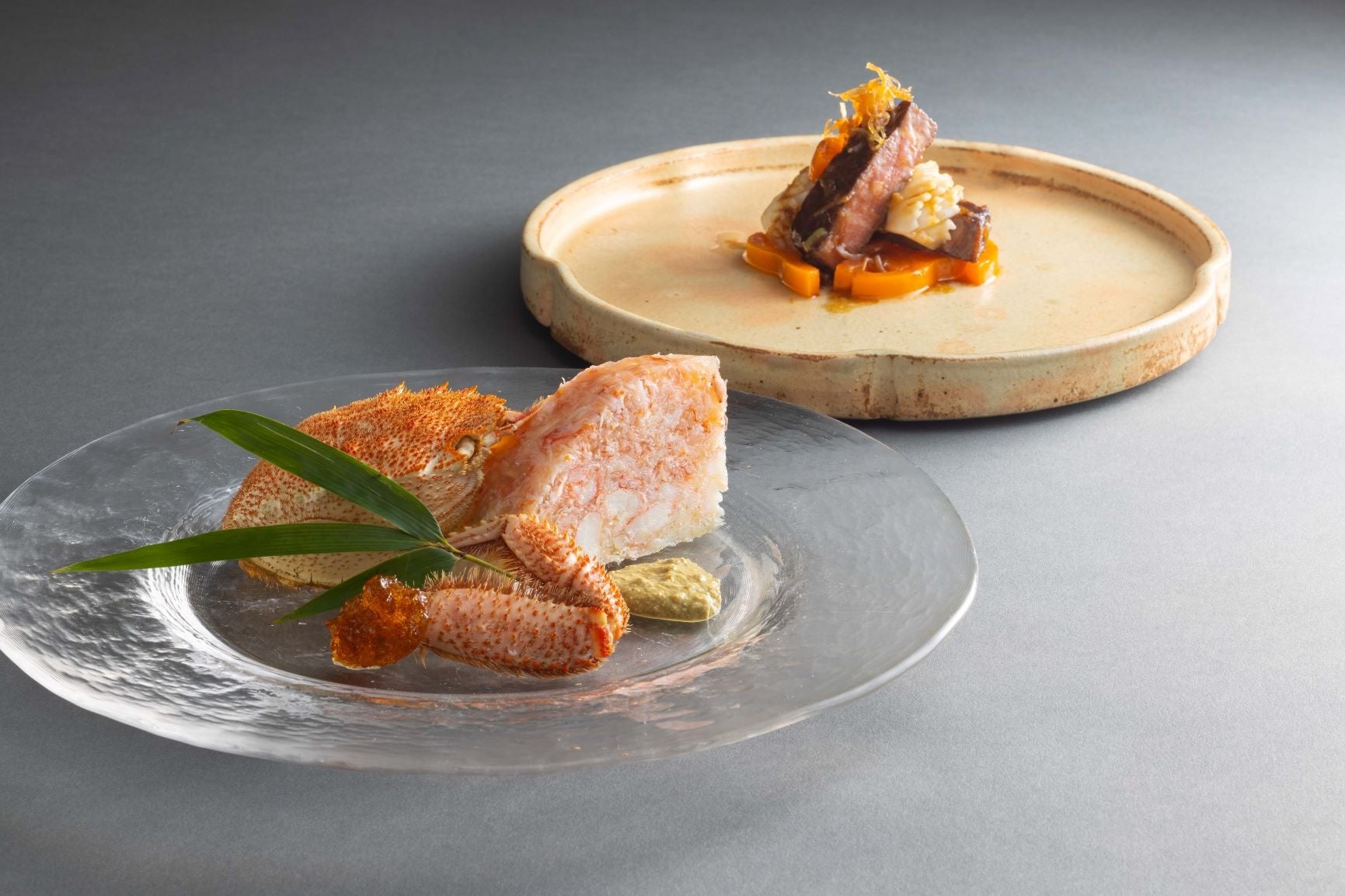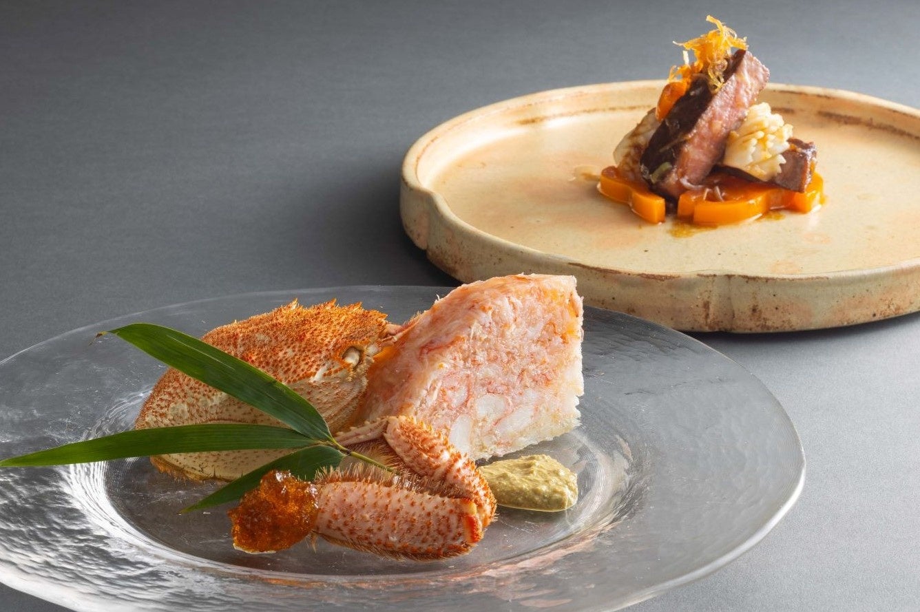 シェフ自らが現地へ赴き選び抜いた山海の幸をふんだんに取り入れたディナーコースは、アミューズ・ブーシュに続き、オホーツク海の流氷から流れ出る栄養で身がしっかり詰まった毛蟹をたっぷりと使用した煮凝りの冷前菜からはじまります。この時季の毛蟹の特長を最大限に引き出した逸品は、添えられた蟹味噌やさっぱりとした酢の利いたジュレで違った味わいをお楽しみいただけます。他にも新鮮な宗谷産帆立貝とメンメ(きんき)に、ふんわりとした卵白を合わせた炒め物など冷温のお料理でご提供いたします。またメイン料理のひとつでは、良質な環境で緻密に飼育された長沼ファームの馬追和牛(まおいわぎゅう)をご用意。赤身のジューシーな柔らかさが特徴です。甘みと香りが際立つサラダパプリカ、剣先イカを個別に加熱し、うまみたっぷりのXO醤で炒め合わせた特別な一皿でお届けいたします。