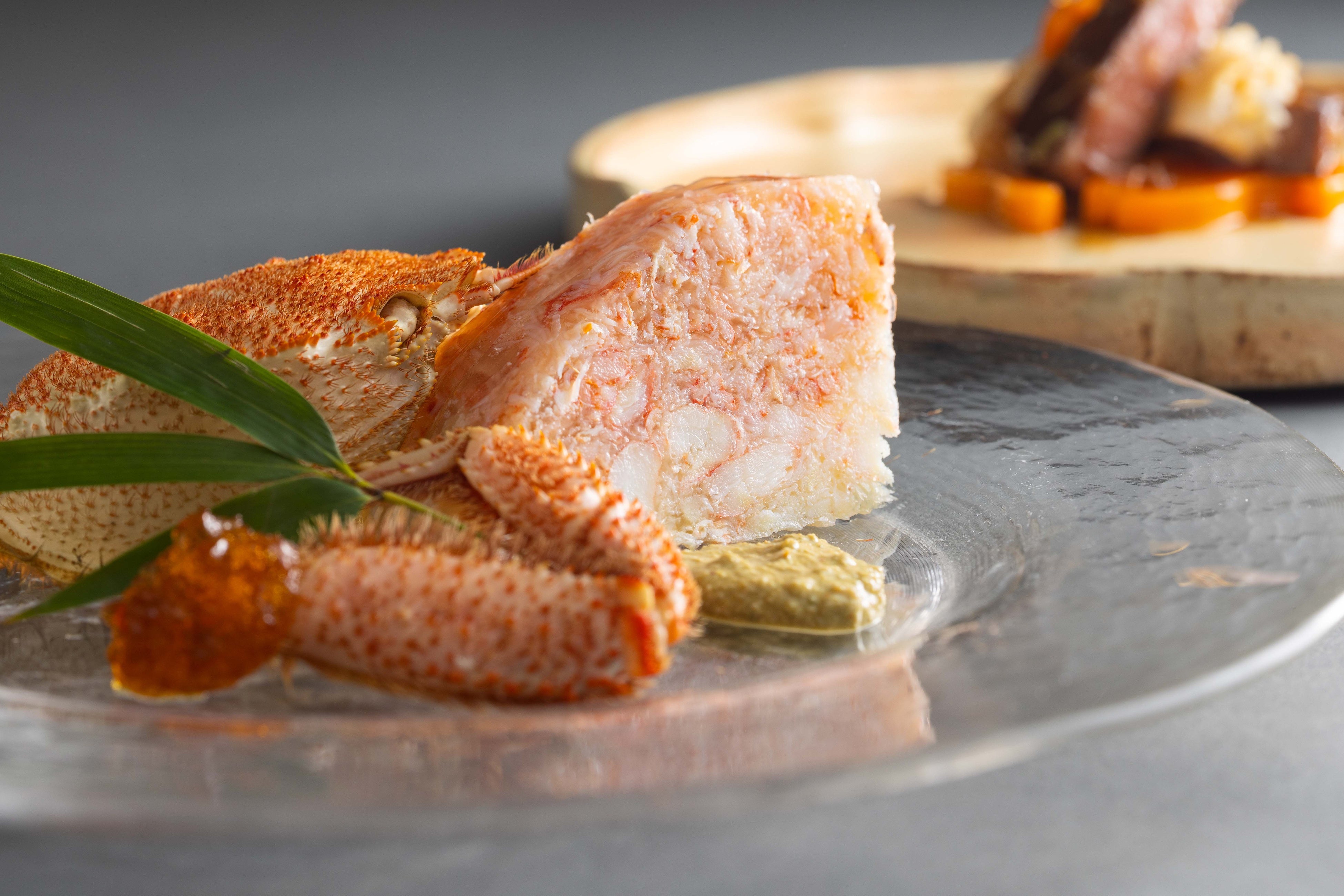 ・北海道産毛蟹の煮凝り冷前菜 ケーキ仕立ての淅江紅醋ジュレ添え
