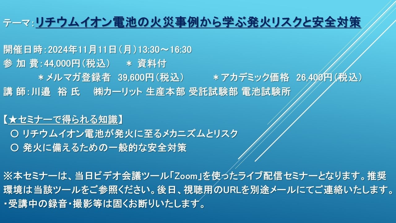 先端技術情報や市場情報を提供している(株)シーエムシー・リサーチ(千代田区神田錦町: https://cmcre.com/ )では、 各種材料・化学品などの市場動向・技術動向のセミナーや書籍発行を行っておりますが、 このたび「リチウムイオン電池の火災事例から学ぶ発火リスクと安全対策」と題するセミナーを、 講師に川邉 裕 氏 ((株)カーリット 生産本部 受託試験部 電池試験所)をお迎えし、2024年11月11日(月)13:30より、 ZOOMを利用したライブ配信で開催いたします。 受講料は、 一般:44,000円(税込)、 弊社メルマガ会員:39,600円(税込)、 アカデミック価格は26,400円(税込)となっております(資料付)。