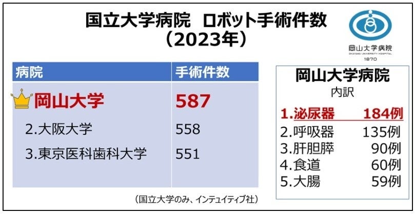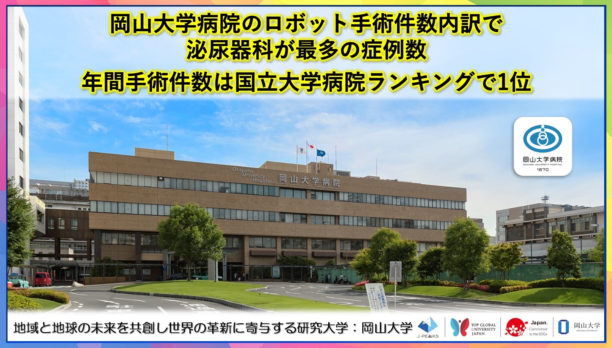 岡山大学病院は、2023年国立大学病院でのロボット手術件数全国1位となり(587件)、泌尿器科領域の件数が最多でした(184件)。