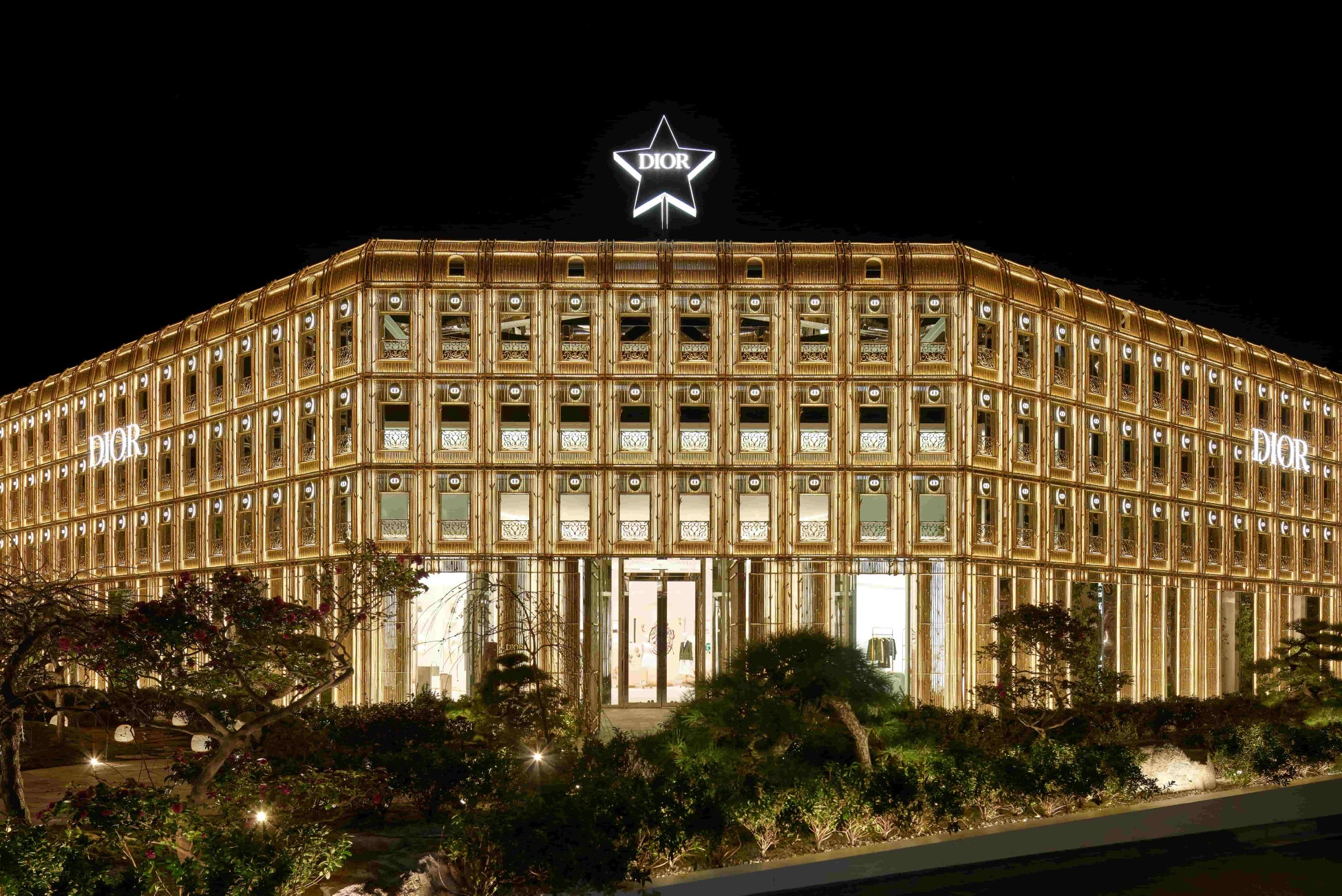 ディオールは、日本との揺るぎない絆を継承し、東京に「ディオール バンブー パビリオン」をオープンいたします。パリの本店「30モンテーニュ」のファサードを想起させる壮麗な建築は、大胆なゴールドに染め上げた、日本の竹林が着想源のバンブーに再構築され、夜にはライトアップされます。