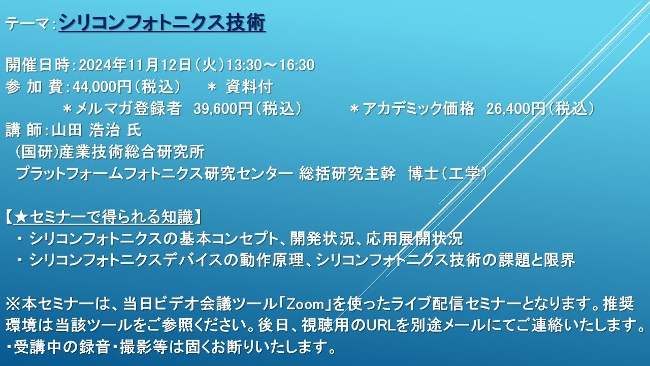 先端技術情報や市場情報を提供している(株)シーエムシー・リサーチ(千代田区神田錦町: https://cmcre.com/ )では、 各種材料・化学品などの市場動向・技術動向のセミナーや書籍発行を行っておりますが、 このたび「シリコンフォトニクス技術」と題するセミナーを、 講師に山田 浩治 氏 ((国研)産業技術総合研究所 プラットフォームフォトニクス研究センター 総括研究主幹 博士(工学))をお迎えし、2024年11月12日(火)13:30より、 ZOOMを利用したライブ配信で開催いたします。 受講料は、 一般:44,000円(税込)、 弊社メルマガ会員:39,600円(税込)、 アカデミック価格は26,400円(税込)となっております(資料付)。