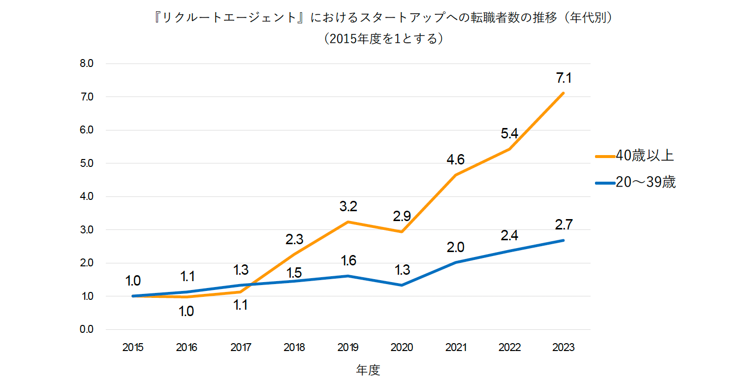 『リクルートエージェント』でのスタートアップへの転職者数を年代別に見ると、2015年度と比べ、2023年度は40歳以上で7.1倍でした。一方、20~39歳では2.7倍と、ミドル・シニア層の方が若い世代よりも転職者数の伸びが顕著でした。
