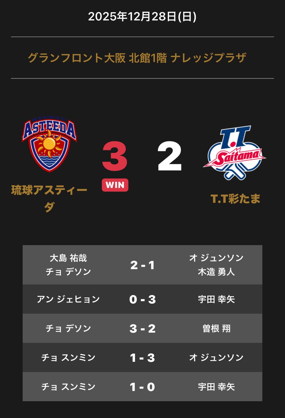 ノジマTリーグ 2025-2026シーズン 公式戦 12月28日開催 「琉球アスティーダ vs T.T彩たま」の試合は、3-2で琉球アスティーダが勝利しました。