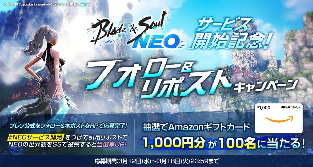 さらに、3月12日からサービス開始した「ブレイドアンドソウルNEO」の世界感がわかるスクリーンショットを添えて引用リポストすると当選確率がアップしますので、ぜひゲームを楽しみながらキャンペーンにもご参加ください。