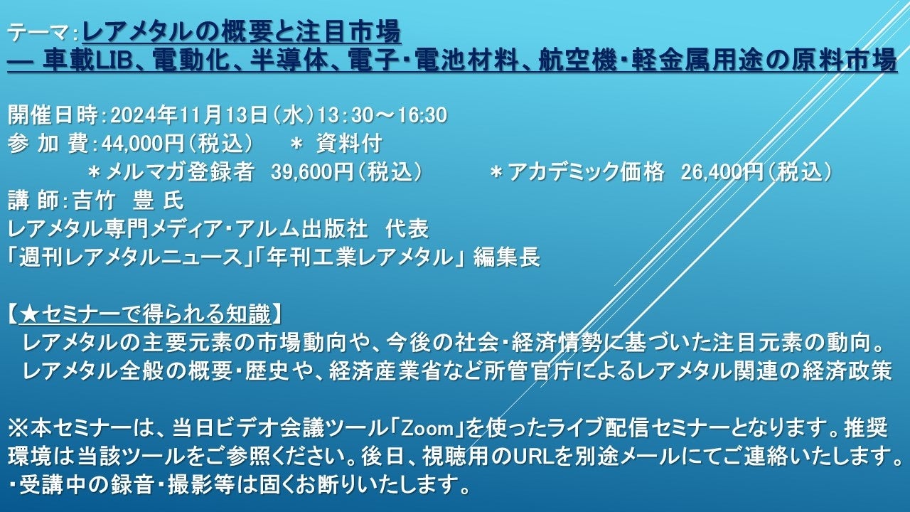 先端技術情報や市場情報を提供している(株)シーエムシー・リサーチ(千代田区神田錦町: https://cmcre.com/ )では、 各種材料・化学品などの市場動向・技術動向のセミナーや書籍発行を行っておりますが、 このたび「レアメタルの概要と注目市場 ― 車載LIB、電動化、半導体、電子・電池材料、航空機・軽金属用途の原料市場」と題するセミナーを、 講師に吉竹 豊 氏 (レアメタル専門メディア・アルム出版社 代表 「週刊レアメタルニュース」「年刊工業レアメタル」 編集長)をお迎えし、2024年11月13日(水)13:30より、 ZOOMを利用したライブ配信で開催いたします。 受講料は、 一般:44,000円(税込)、 弊社メルマガ会員:39,600円(税込)、 アカデミック価格は26,400円(税込)となっております(資料付)。