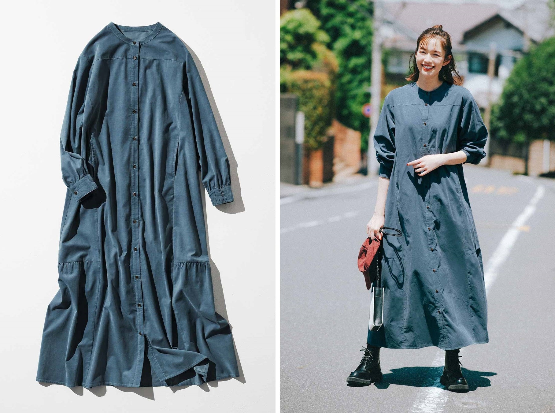 顔が明るく見えて、かっこよくもかわいくも着こなせる、グレイッシュブルーのワンピースです。バッグを合わせたり、真っ白なマフラーを巻いたり、ボタンを開けてタートルを差しても。キャップをかぶれば友だちと遊びに行きたくなるし、パンプスならデートにも……」と栞里ちゃんのさまざまなアイデアや思いが詰まっています。
