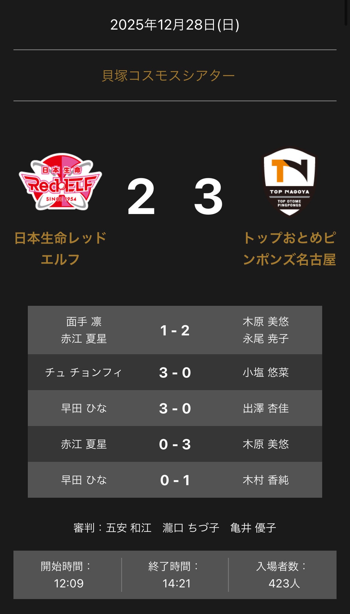 ノジマTリーグ 2025-2026シーズン 公式戦 12月28日(日)開催 日本生命レッドエルフ vs トップおとめピンポンズ名古屋 試合結果