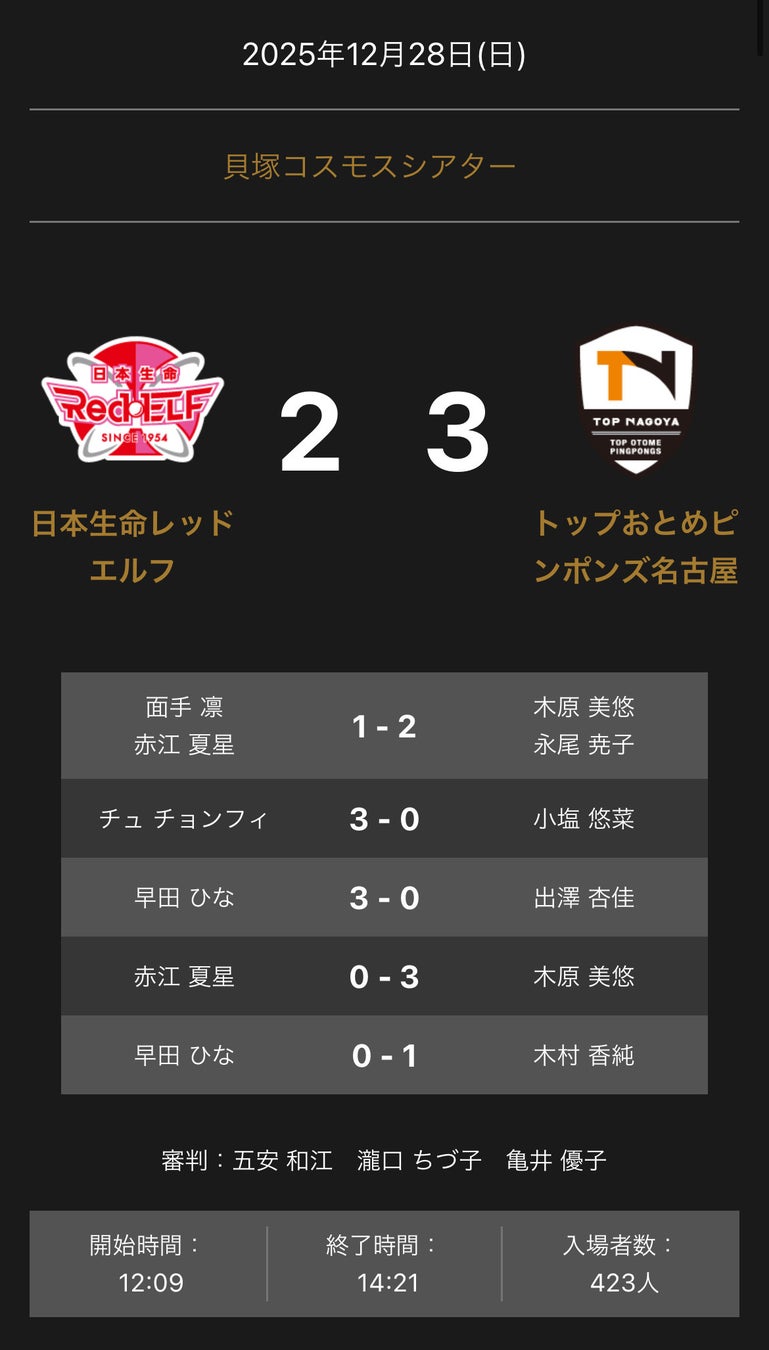 ノジマTリーグ 2025-2026シーズン 公式戦 12月28日(日)開催 日本生命レッドエルフ vs トップおとめピンポンズ名古屋の試合は、3-2でトップおとめピンポンズ名古屋が勝利しました。