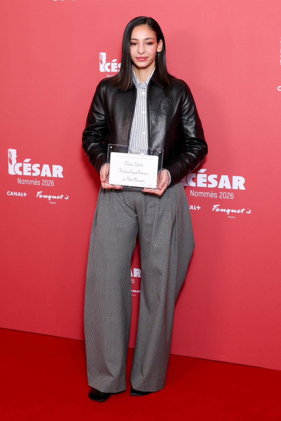 ナディア・メリティは、ホワイトのストライプシャツの上にブラックのレザージャケットを着用し、グレーのウール&シルクのパンツを合わせたルックを披露しました。