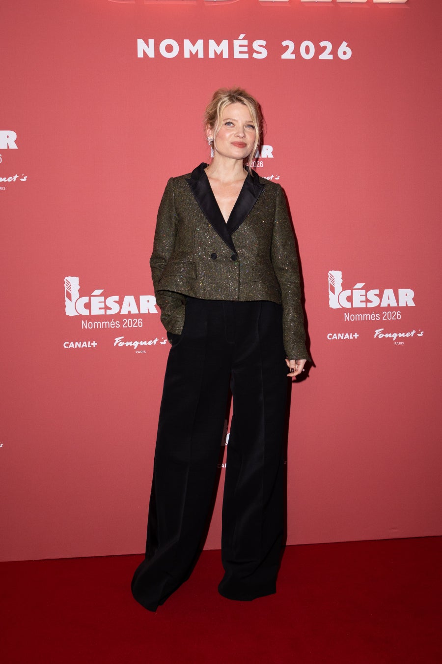 メラニー・ティエリーは、2026年春夏 コレクションのカーキのウールジャケットに、ブラックのウール&シルクのパンツを合わせた装いで登場しました。