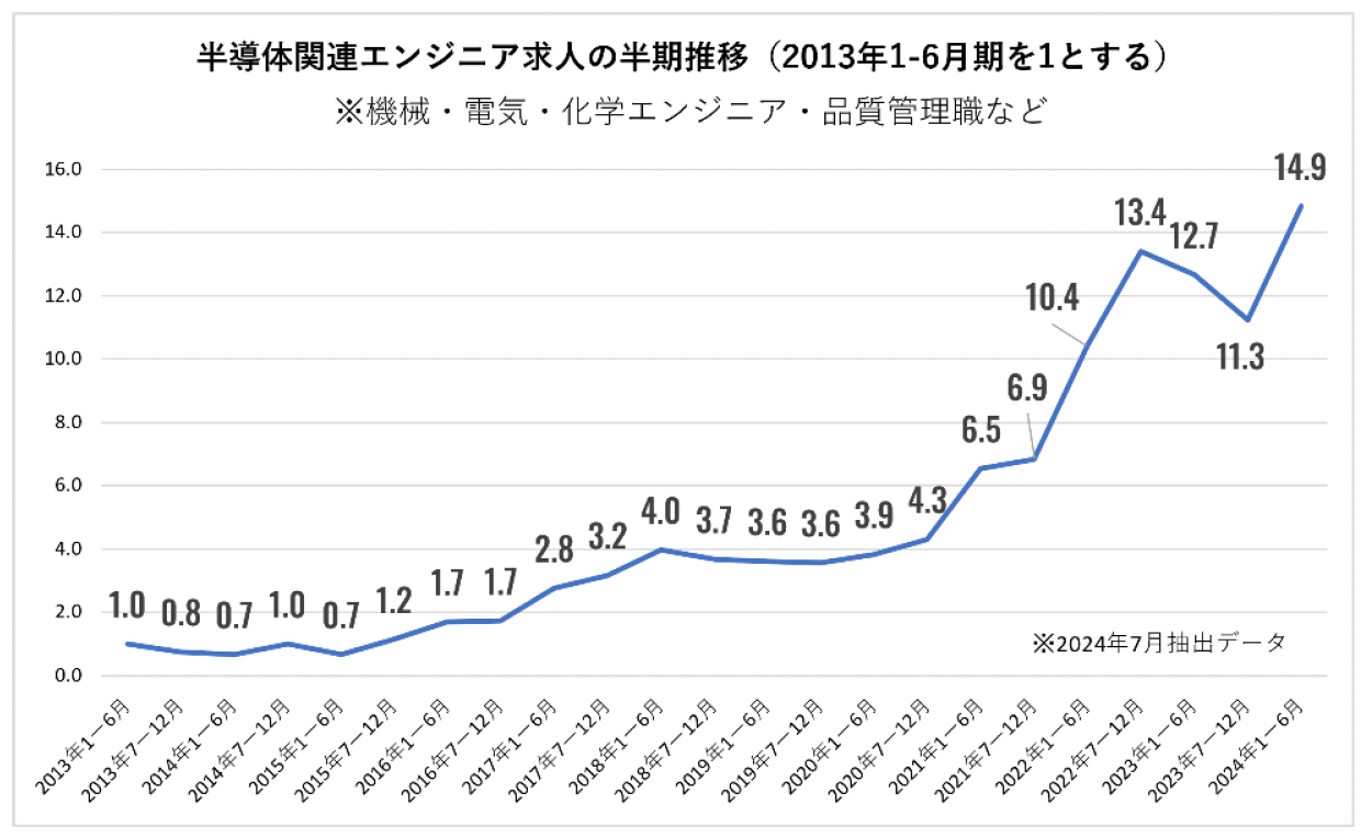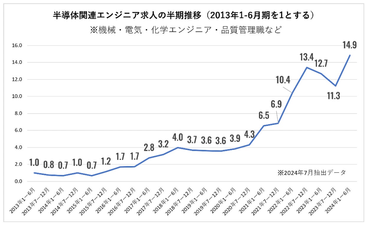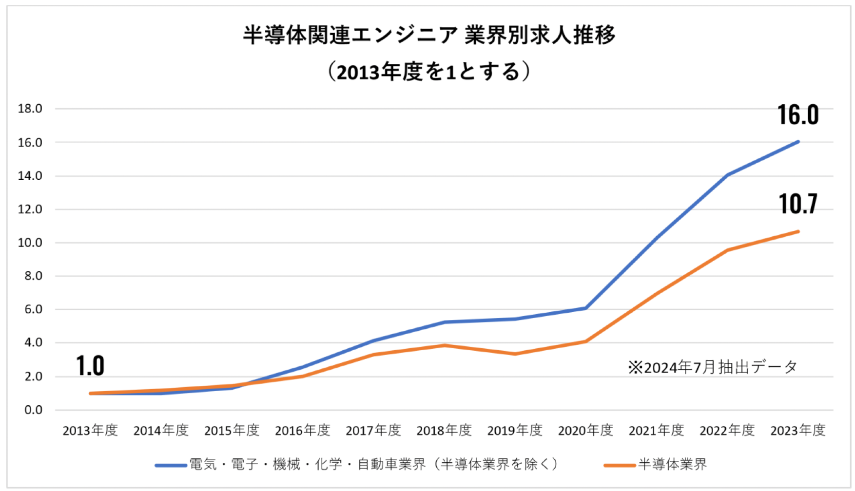 「電気・電子・機械・化学・自動車業界」の「半導体関連エンジニア」求人は10年で16.0倍に