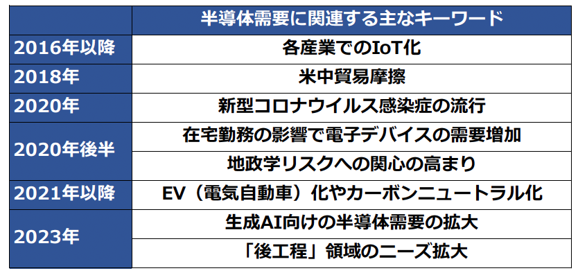 2021年以降はEV化やカーボンニュートラル化への取り組みが本格化し、「半導体関連エンジニア」の需要が一層高まりました。さらに2023年以降、生成AI向けの半導体需要が急速に拡大しており、求人も増加しています。