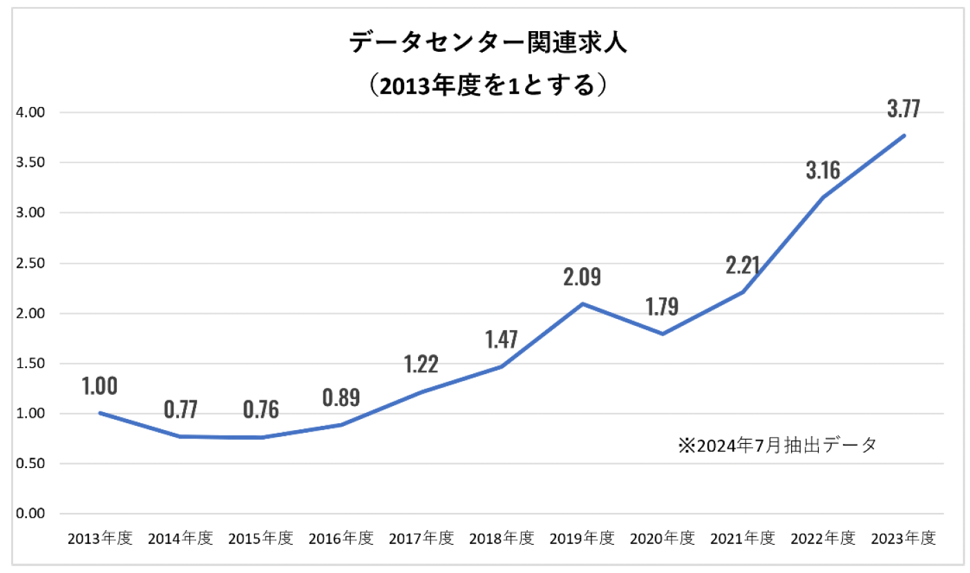 以下のグラフは、データセンターに関連する求人を抽出したもので、2013年度を1として、2023年度には3.77倍に増加しています。AI技術の発展、クラウドサービスの普及、ビッグデータの活用、5G技術の展開などが求人増加の背景として考えられます。
