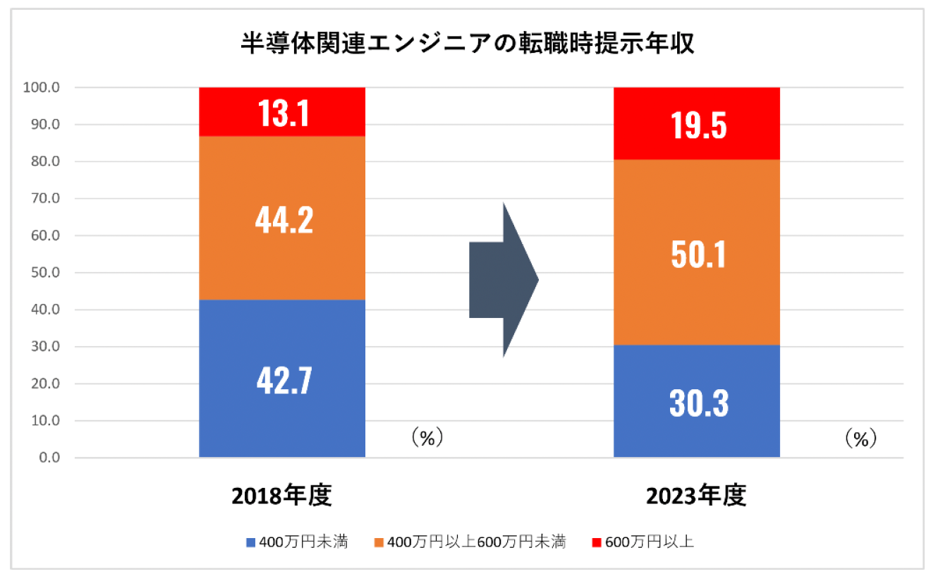 一方で、400万円未満の割合は42.7%から30.3%に減少しています。「半導体関連エンジニア」求人への転職時には、提示される年収が高くなってきていると言えます。