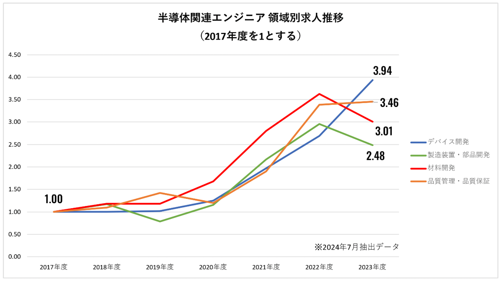 「半導体関連エンジニア」求人のうち「デバイス開発」「製造装置・部品開発」「材料開発」「品質管理・品質保証」の4つの領域を見ると、「デバイス開発」「品質管理・品質保証」「材料開発」が2017年度に比べ、いずれも3倍以上に増加しています。特に「デバイス開発」は2022年度から2023年度にかけて大きく増加しており、ニーズが高まっている様子がうかがえます。