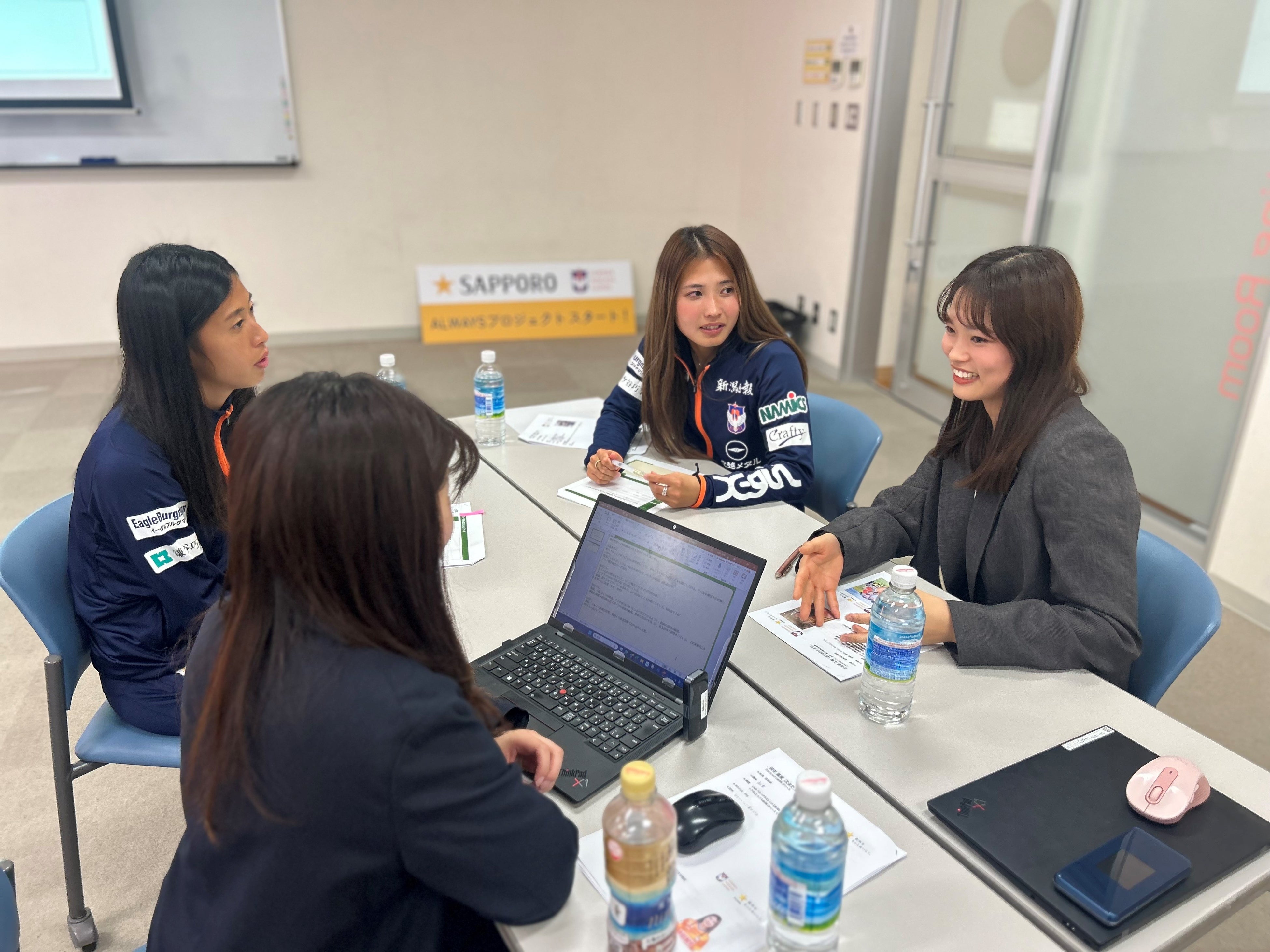 当社は本年4月からアルビレックス新潟レディースとパートナー契約を締結し、「ALWAYSプロジェクト」として、女性の活躍や子どもたちの夢を応援するプロジェクトを共同事業として取り組んでいます。今回の交流会・ワークショップでは、当社女性社員6名とアルビレックス新潟レディース所属の有吉 佐織選手、園田 瑞貴選手、石淵 萌実選手、滝川 結女選手、山谷 瑠香選手、田中 聖愛選手(計6名)によるディスカッションを実施しました。