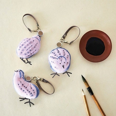 丸いからだにしま模様、ちょこんととがったくちばしまで、蕙斎が描いたウズラの愛らしさを再現。デザインは〈わっ!〉〈うとうと……〉〈おしり〉の3種類です。内側の金具にかぎを付ければ、バッグに付けたままリールで引き出せます。ウズラの背面に入れた「蕙斎筆」の刺しゅうは、『鳥獣略画式』と同じく蕙斎が描いた絵手本『人物略画式』の奥付の文字を参考にしました。