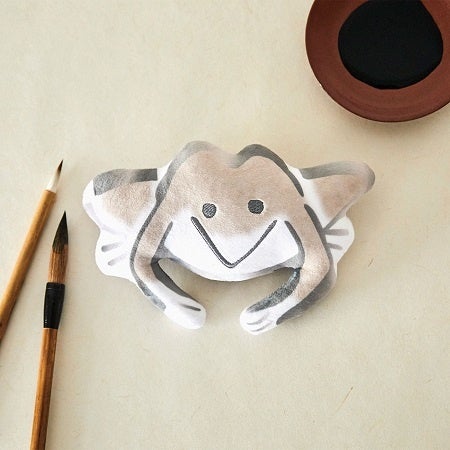 蕙斎の筆運びをそのままに、ふっくらと半立体化したカエルのポーチです。両手のひらに収まるサイズ感のポーチには、もちもちのわたがたっぷり入っていて、むにっとやわらかボディーなのが特徴です。微起毛素材にほどこされた目や口の刺しゅうがアクセントになっています。