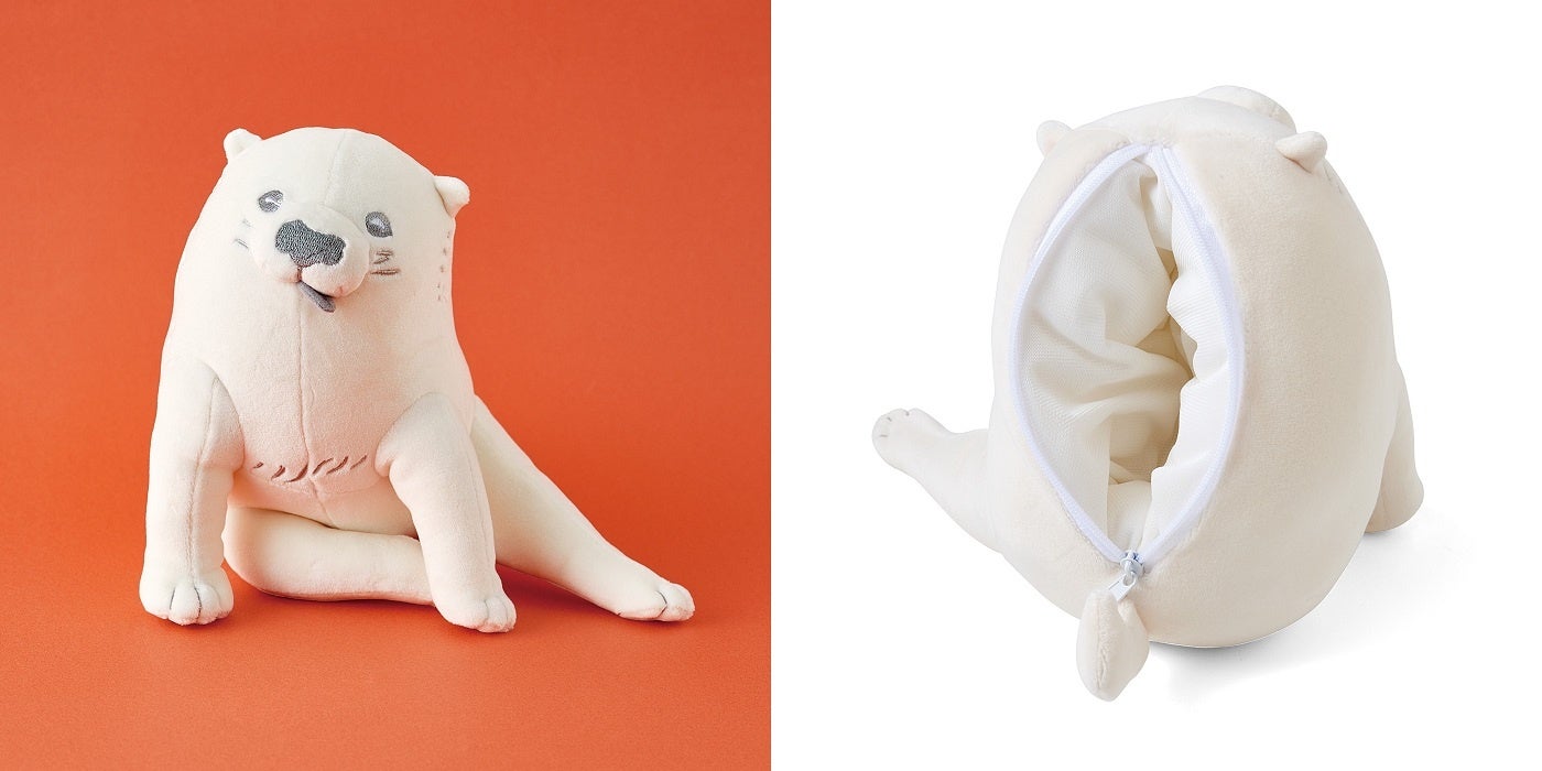 ユーモラスな目つきと、もっちりとした猫のような前足、するんと長い尻尾が印象的なクッションです。約600mlの湯たんぽが入るので、ひざの上にのせてぽかぽかあったまることもできます。後ろ姿もしっかり描かれていて、おしりにプリントされた「蕙斎筆 紹眞」の文字がワンポイントです。