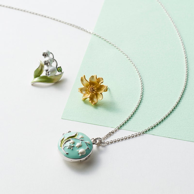 <ヴァンドームブティック>奥: ブローチ2点セット 18,700円 (合金・合成樹脂・ガラス/スズラン:縦約23×横約20mm、マーガレット:縦約19×横約19mm) 手前: ネックレス 25,300円 (合金・合成樹脂・ガラス/全長:約55cm+アジャスター約7cm) □伊勢丹新宿店 本館1階 アクセサリー/ヴァンドームブティック
