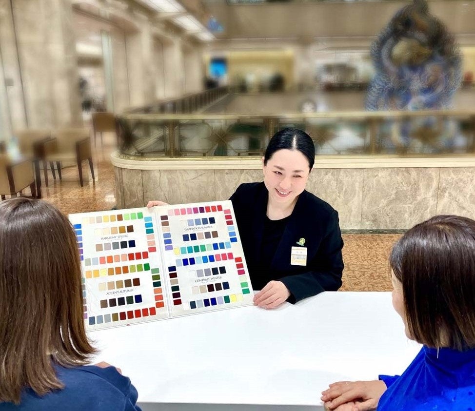 まずは母娘でパーソナル診断(ベストカラー診断または骨格スタイル分析®を選択)。つぎにお母さまにお似合いのお洋服選び。専門の資格をもつコンシェルジュが、ブランドの垣根を越えてスタイリングのご提案をいたします。