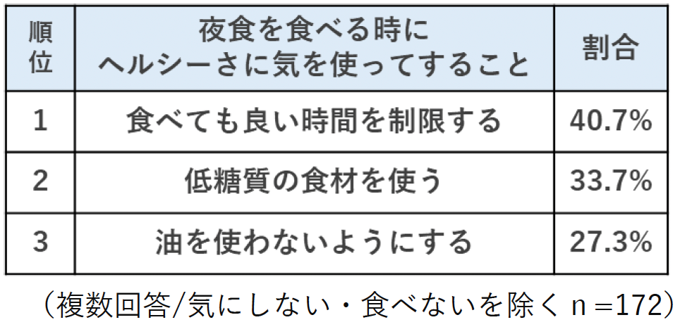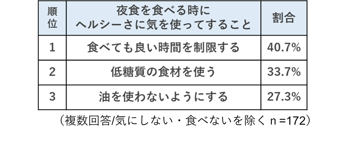 ■夜食を食べる時にヘルシーさに気を使ってすることは、「時間帯の制限」と「低糖質」「ノンオイル」