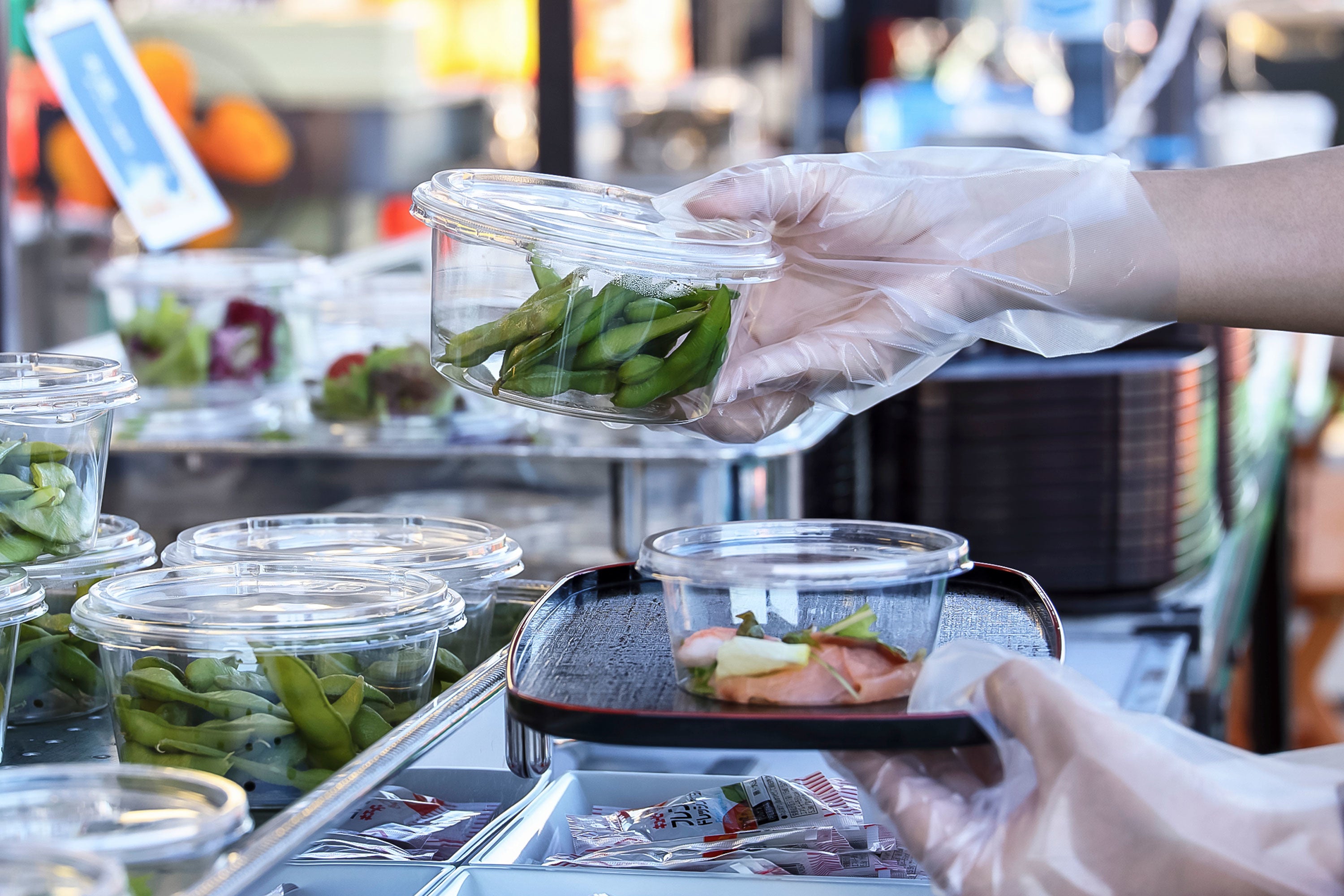 スタッフはマスクを着用し、食品・飲料を扱うスタッフは使い捨て手袋を使用いたします。