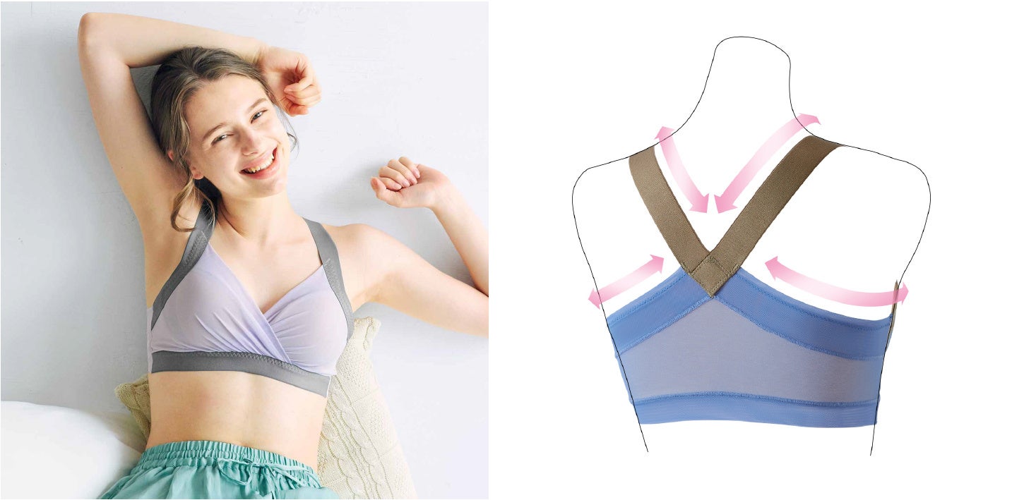伸びやかで快適なナイトブラです。ノンワイヤーで肩甲骨周辺はたすきのようなストラップになっているので、背筋を意識させながら締め付け感がありません。フロントクロスなので着脱も簡単です。