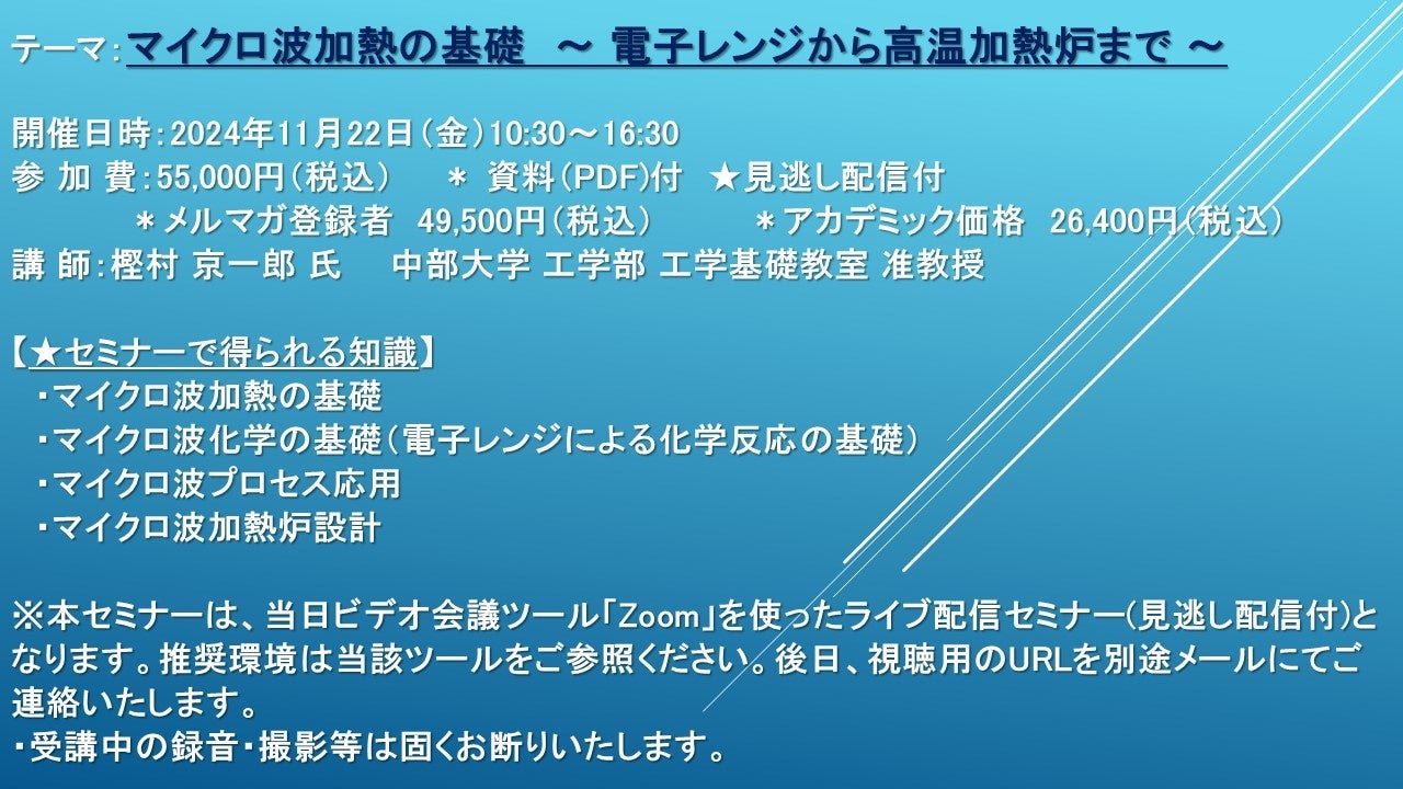 先端技術情報や市場情報を提供している(株)シーエムシー・リサーチ(千代田区神田錦町: https://cmcre.com/ )では、 各種材料・化学品などの市場動向・技術動向のセミナーや書籍発行を行っておりますが、 このたび「マイクロ波加熱の基礎 ~ 電子レンジから高温加熱炉まで ~」と題するセミナーを、 講師に樫村 京一郎 氏 (中部大学 工学部 工学基礎教室 准教授)をお迎えし、2024年11月22日(金)10:30より、 ZOOMを利用したライブ配信(見逃し配信付き)で開催いたします。 受講料は、 一般:55,000円(税込)、 弊社メルマガ会員:49,500円(税込)、 アカデミック価格は26,400円(税込)となっております(資料付)。