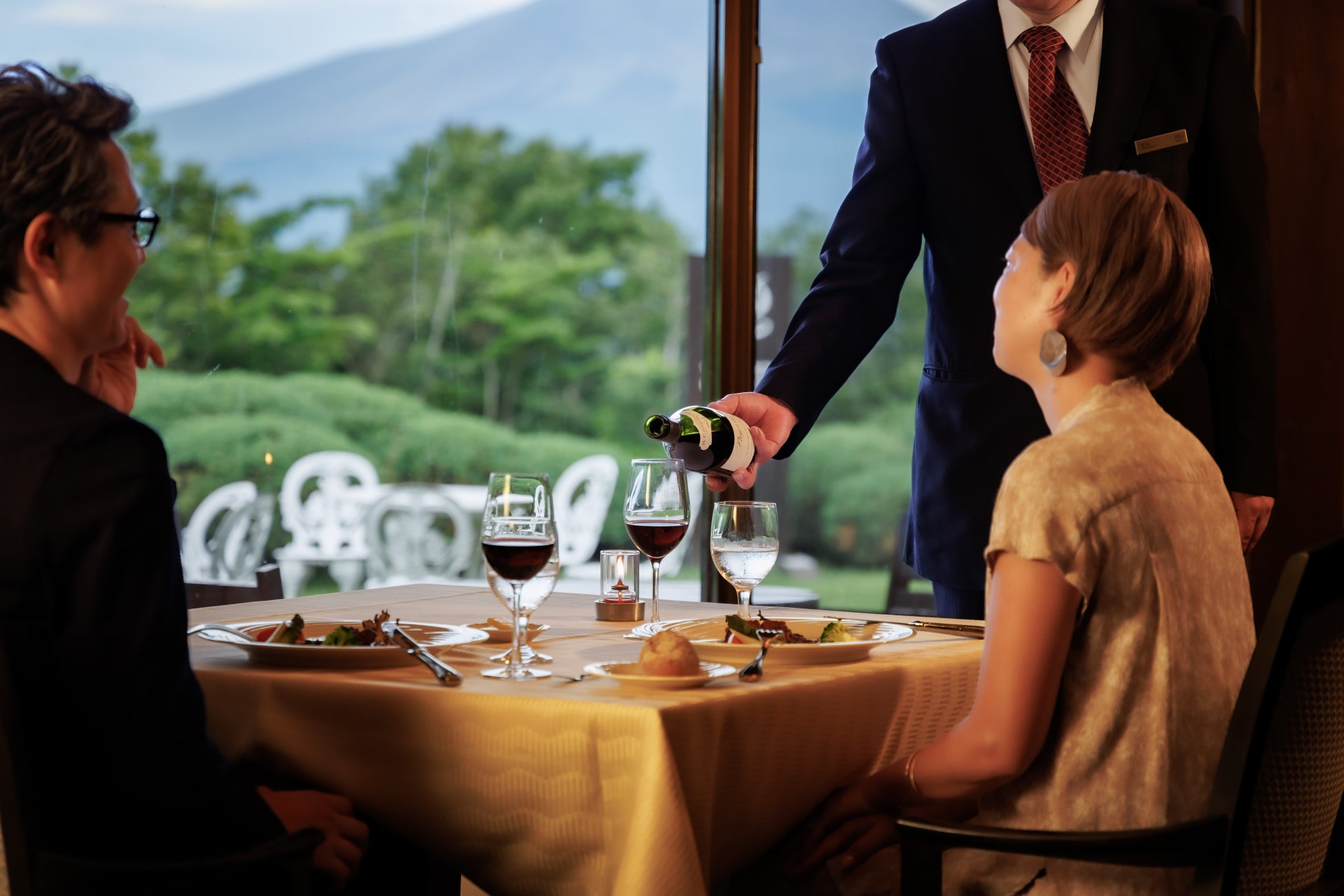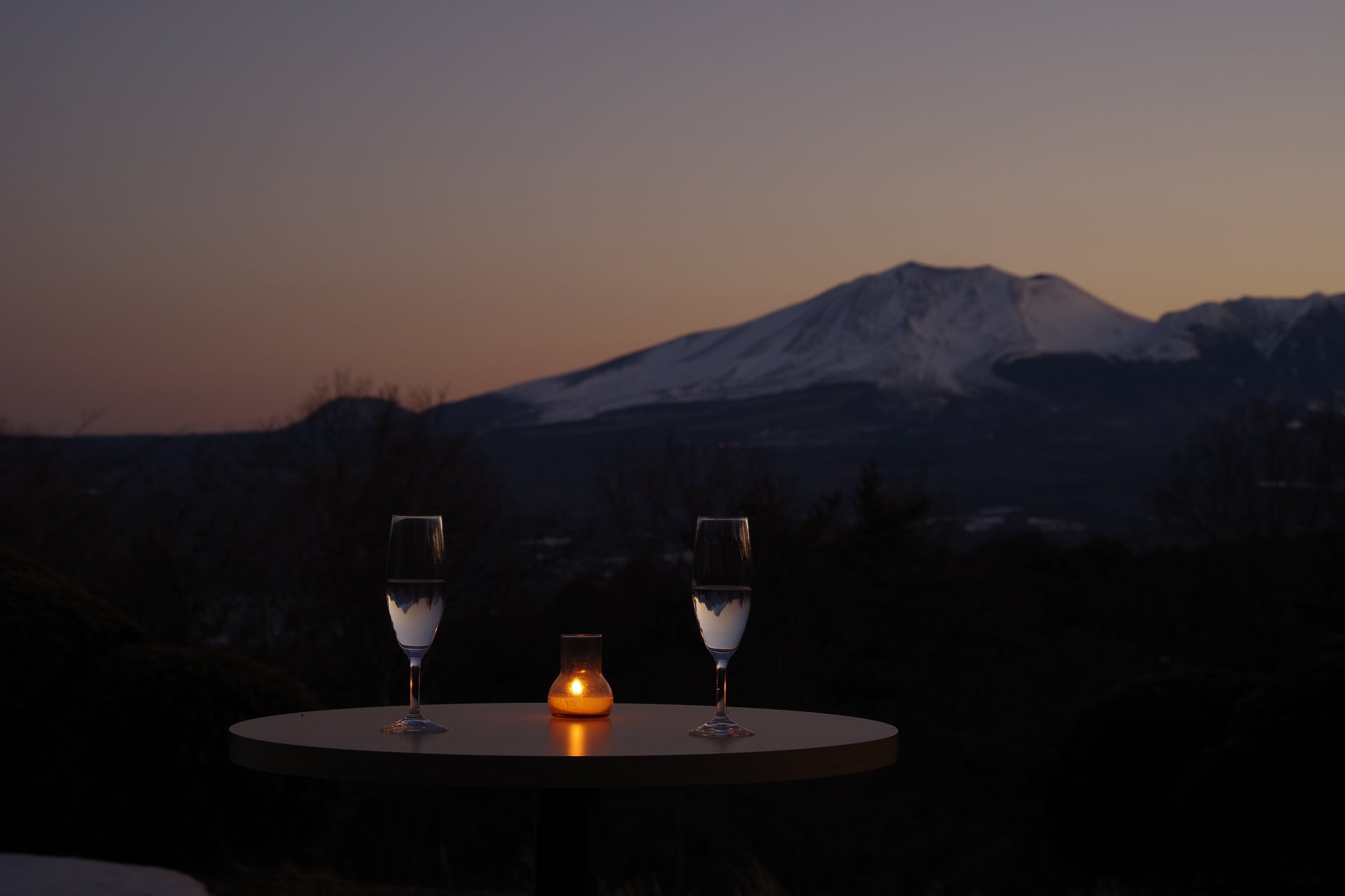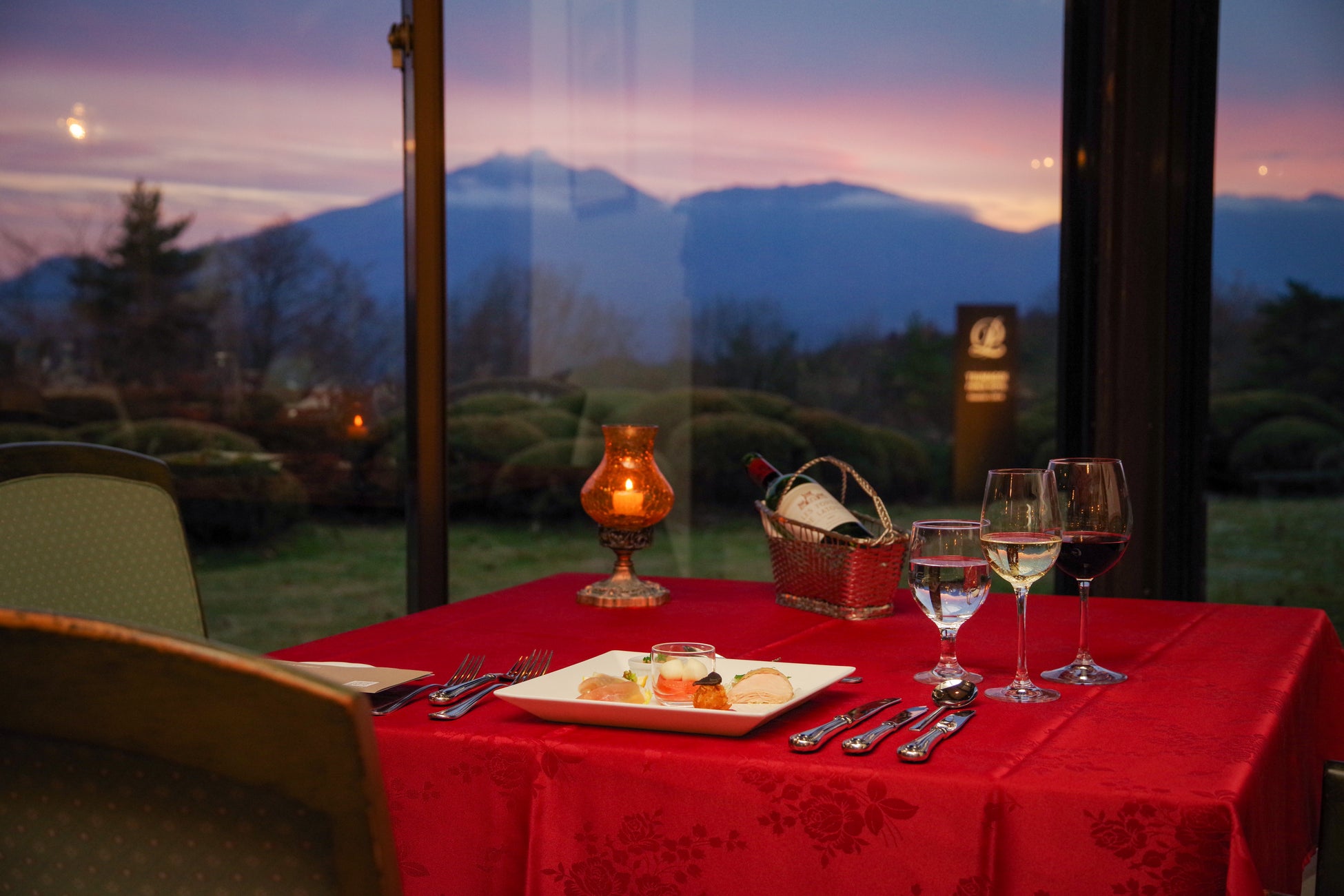 雄大な浅間山や浅間連峰を望むホテルレストランのテラスからは雪解けの季節を迎える山々の稜線が広がります。パチパチと音を立てるスエーデントーチの炎の横でお酒をいただき、そばにはご夫婦との心地よい時間を一緒に過ごす愛犬がいる癒しの時間を演出いたします。