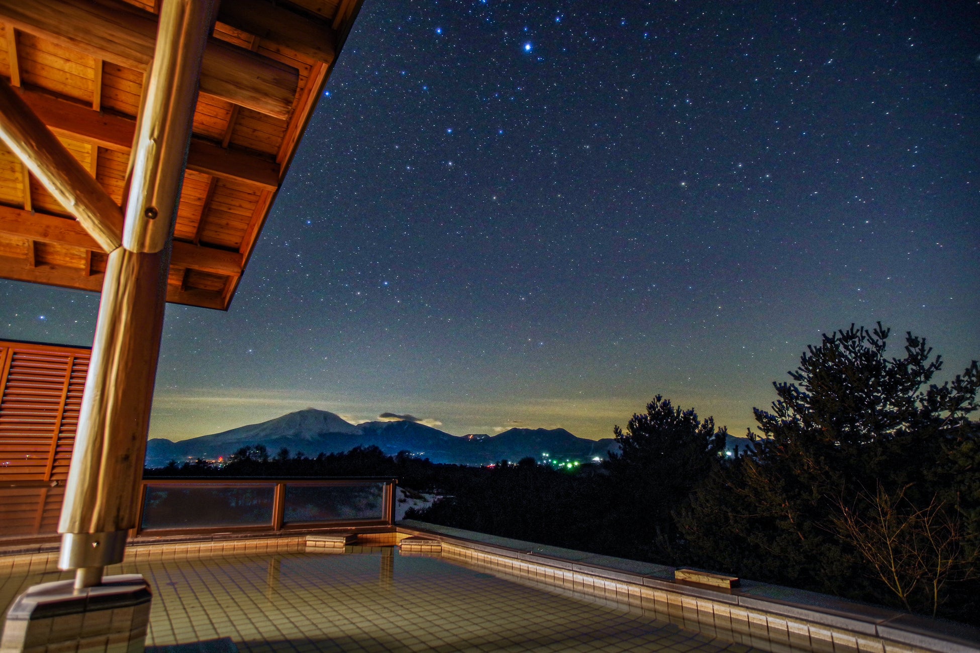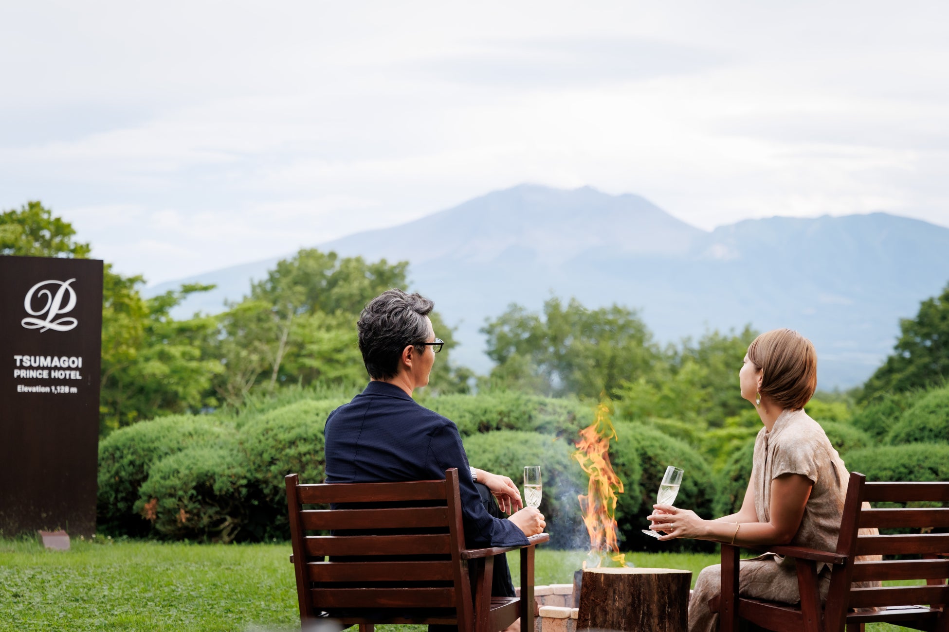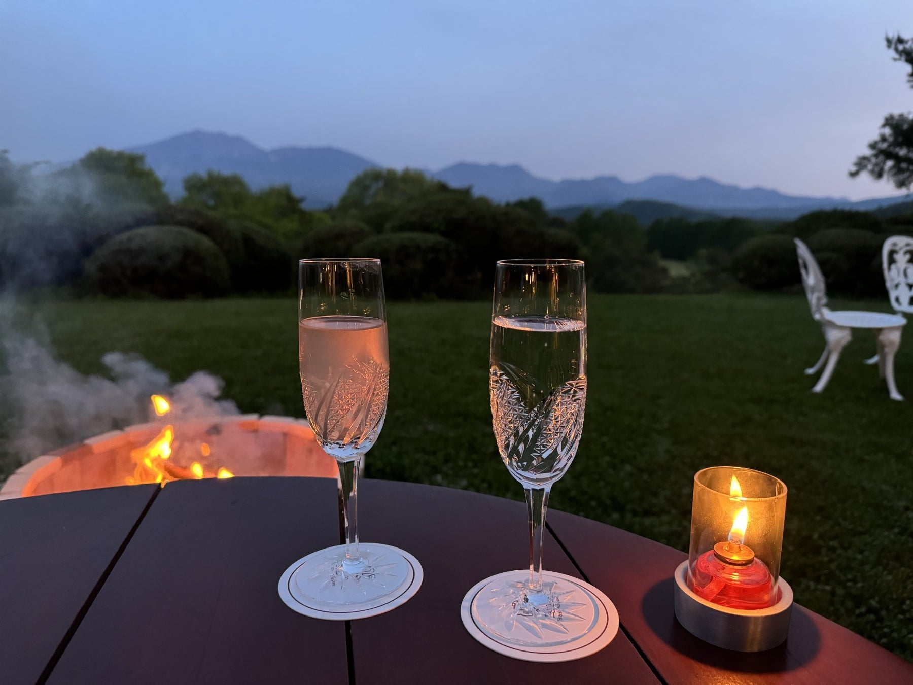 雄大な浅間山や浅間連峰を望むホテルレストランのテラスからは雪解けの季節を迎える山々の稜線が広がります。パチパチと音を立てるスエーデントーチの炎の横でお酒をいただき、そばにはご夫婦との心地よい時間を一緒に過ごす愛犬がいる癒しの時間を演出いたします。