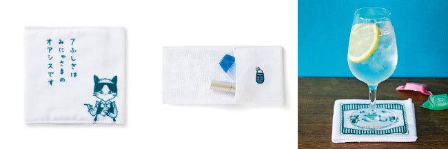 ひっくり返すと、お店からのひと言が書かれた遊び心たっぷりなデザインです。小物が入る内側のポケットにリップなどを入れておけば、化粧直しに立つときもスマートにこなせます。ポケットにはワンポイントでメニューがプリントされています。やわらかなタオル地を三つ折りにしているので、ハンドタオルとしても十分な使い心地、もちろんコースターとしても使えます。