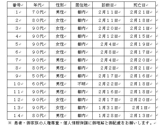 都内で新型コロナウイルスに感染した方が死亡されましたのでお知らせします。