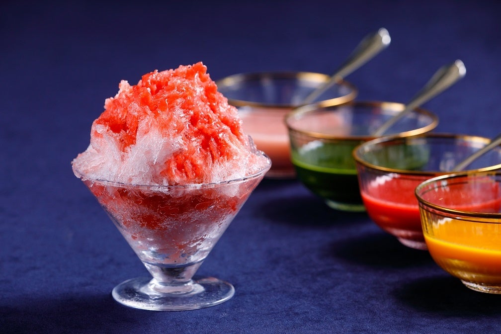 会場内に設置された特設コーナーでは、ホテルのパティシエがオーダーメイドでオリジナルのかき氷を仕上げます。目の前で削った氷と練乳アイス、ホテル特製の果肉入りフルーツソースが合わさった、贅沢なかき氷の出来上がりです。ソースは苺・桃・マンゴーのフルーツソースに加え、王道の抹茶ソースを加えた4種の中からお選びいただけます。
