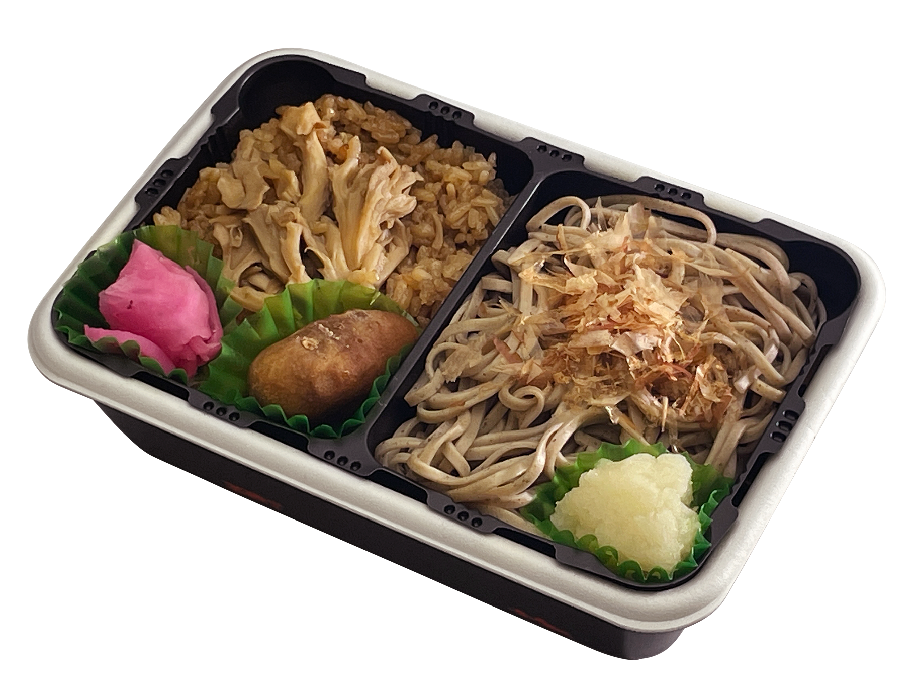越前大野名物、九頭竜舞茸の香り豊かなごはんと、越前そばが一度に楽しめます。