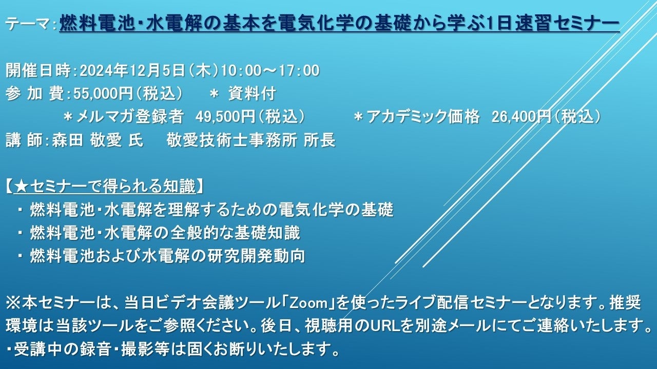先端技術情報や市場情報を提供している(株)シーエムシー・リサーチ(千代田区神田錦町: https://cmcre.com/ )では、 各種材料・化学品などの市場動向・技術動向のセミナーや書籍発行を行っておりますが、 このたび「燃料電池・水電解の基本を電気化学の基礎から学ぶ1日速習セミナー」と題するセミナーを、 講師に森田 敬愛 氏 (敬愛技術士事務所 所長)をお迎えし、2024年12月5日(木)10:00より、 ZOOMを利用したライブ配信で開催いたします。 受講料は、 一般:55,000円(税込)、 弊社メルマガ会員:49,500円(税込)、 アカデミック価格は26,400円(税込)となっております(資料付)。