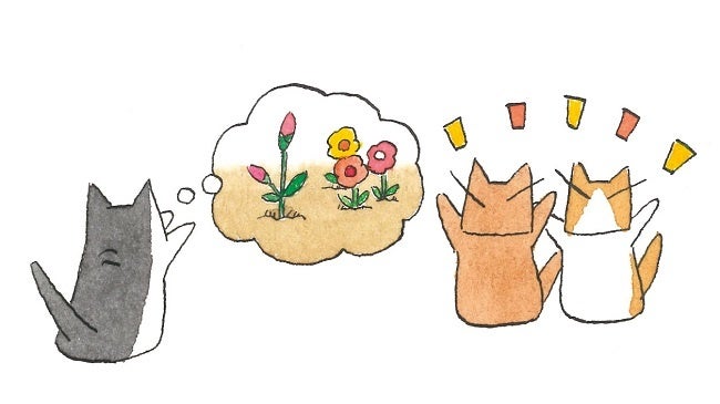 日付の余白部分では、12ヵ月を通して3匹の猫のストーリーが展開されます。2023年版は、お庭にお花を植えるために、猫たちが奮闘するストーリーです。